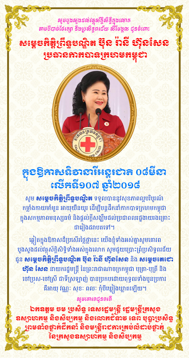 (ភ្នំពេញ)៖ នាឱកាសដ៏ប្រសើរថ្លៃថ្លានៃទិវានារីអន្តរជាតិ ៨មីនា លើកទី១០៧ ឆ្នាំ២០១៨នេះ ឯកឧត្ដម ចម ប្រសិទ្ធ ទេសរដ្ឋមន្រ្តី រដ្ឋមន្រ្តីក្រសួងឧស្សាហកម្ម និងសិប្បកម្ម និងលោកជំទាវ ទេព បុប្ផាប្រសិទ្ធ ព្រមទាំងថ្នាក់ដឹកនាំ និងមន្រ្តីរាជការគ្រប់លំដាប់ថ្នាក់ នៃក្រសួងឧស្សាហកម្ម និងសិប្បកម្ម សូមគោរពជូនពរ សម្តេចកិត្តិព្រឹទ្ធបណ្ឌិត ប៊ុន រ៉ានី ហ៊ុនសែន ទទួលបាននូវសុខភាពល្អបរិបូរណ៍ កម្លាំងកាយមាំមួន អាយុយឺនយូរ ដើម្បីបន្តដឹកនាំកាកបាទក្រហមកម្ពុជា ក្នុងសកម្មភាពមនុស្សធម៌ និងផ្ដល់ក្ដីសង្ឃឹមដល់ប្រជាពលរដ្ឋងាយរងគ្រោះជារៀងដរាបតទៅ។