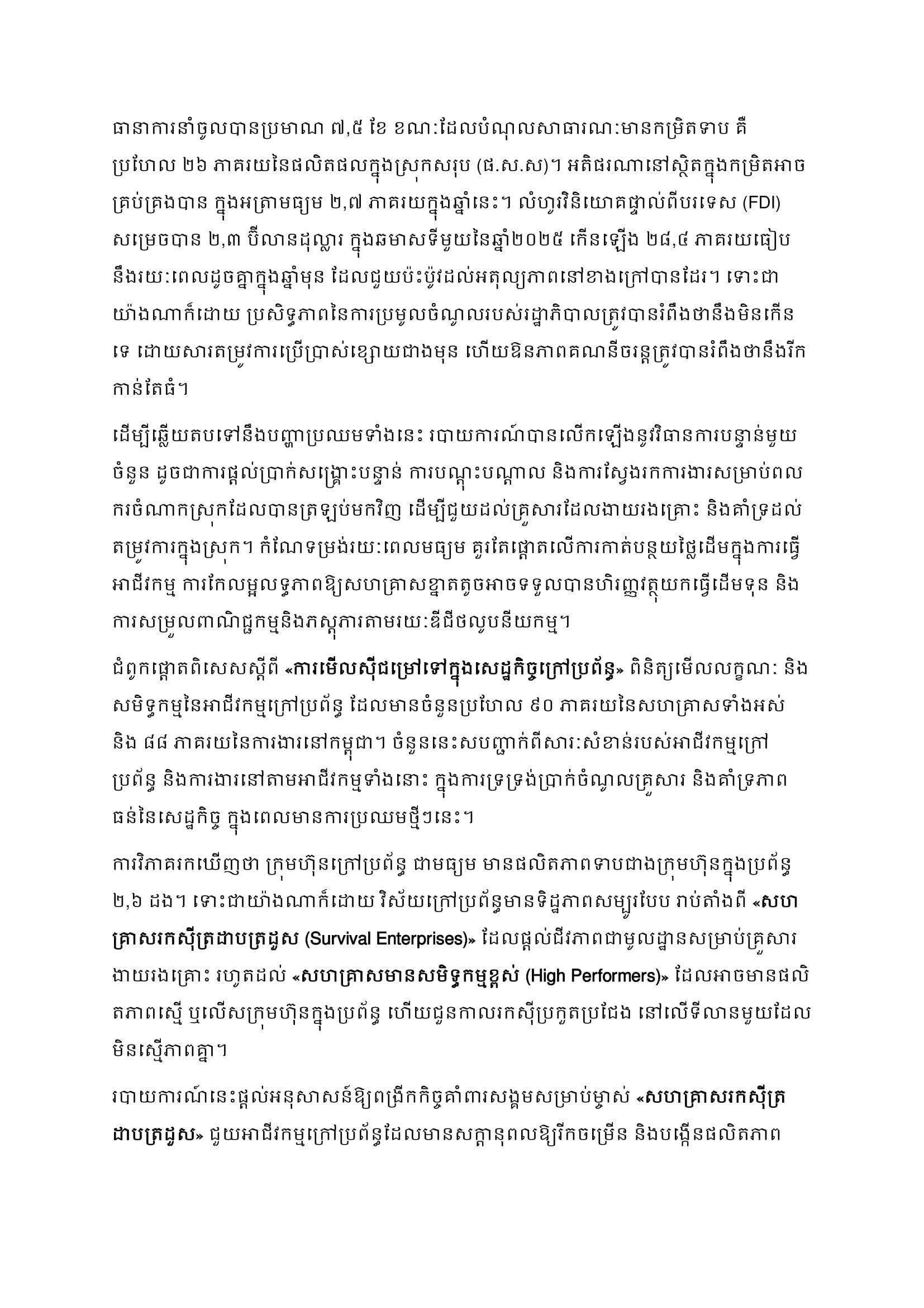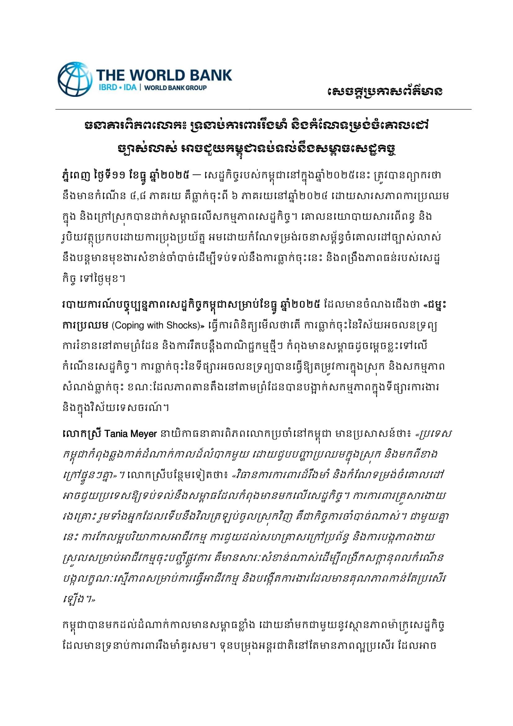 របាយការណ៍បច្ចុប្បន្នភាពសេដ្ឋកិច្ចកម្ពុជា សម្រាប់ខែធ្នូ ឆ្នាំ២០២៥ ដែលមានចំណងជើងថា «ជម្នះការប្រឈម (Coping with Shocks)» ធ្វើការពិនិត្យមើលថាតើ ការធ្លាក់ចុះ នៃវិស័យអចលនទ្រព្យ ការរំខាននៅតាមព្រំដែន និងការរឹតបន្តឹងពាណិជ្ជកម្មថ្មីៗ កំពុងមានសម្ពាធដូចម្តេចខ្លះទៅលើកំណើនសេដ្ឋកិច្ច។ ការធ្លាក់ចុះនៃទីផ្សារអចលនទ្រព្យ បានធ្វើឱ្យតម្រូវការក្នុងស្រុក និងសកម្មភាពសំណង់ធ្លាក់ចុះ ខណៈដែលភាពតានតឹងនៅតាមព្រំដែនបានបង្អាក់សកម្មភាពក្នុងទីផ្សារការងារ និងក្នុងវិស័យទេសចរណ៍។