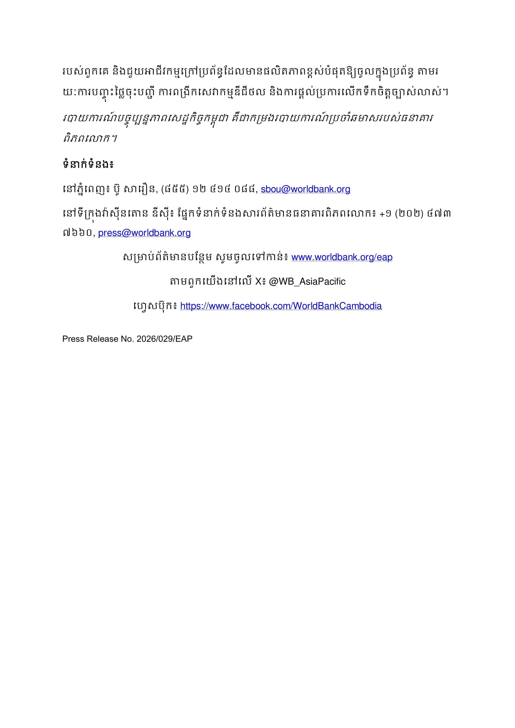 របាយការណ៍បច្ចុប្បន្នភាពសេដ្ឋកិច្ចកម្ពុជា គឺជាកម្រងរបាយការណ៍ប្រចាំឆមាសរបស់ធនាគារពិភពលោក៕