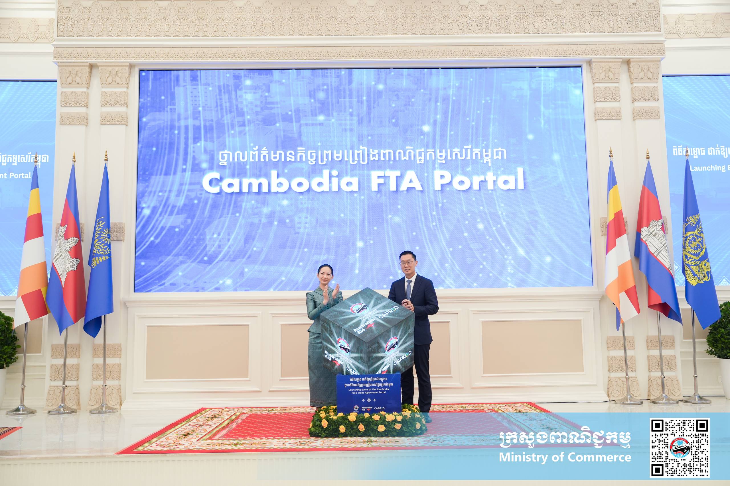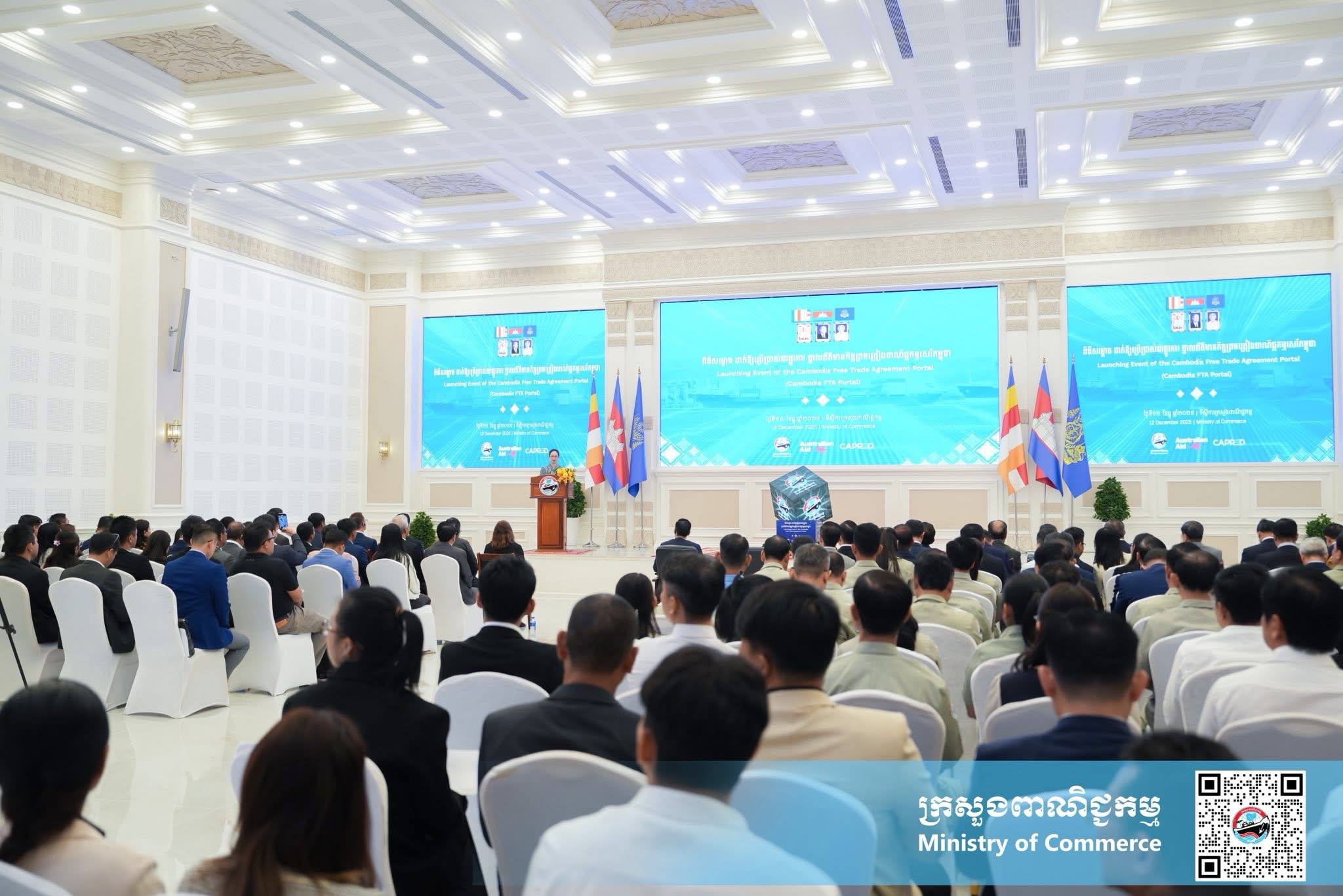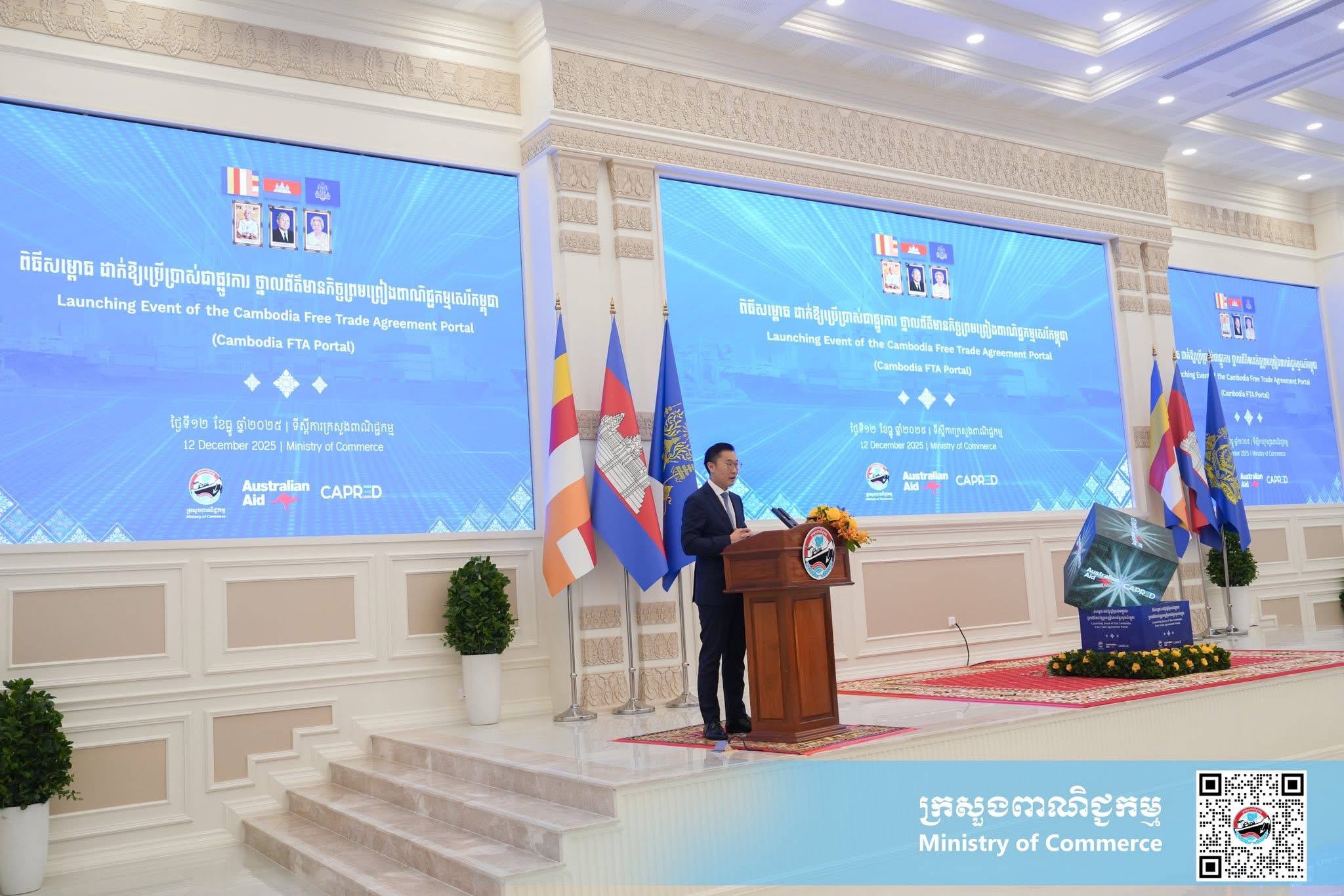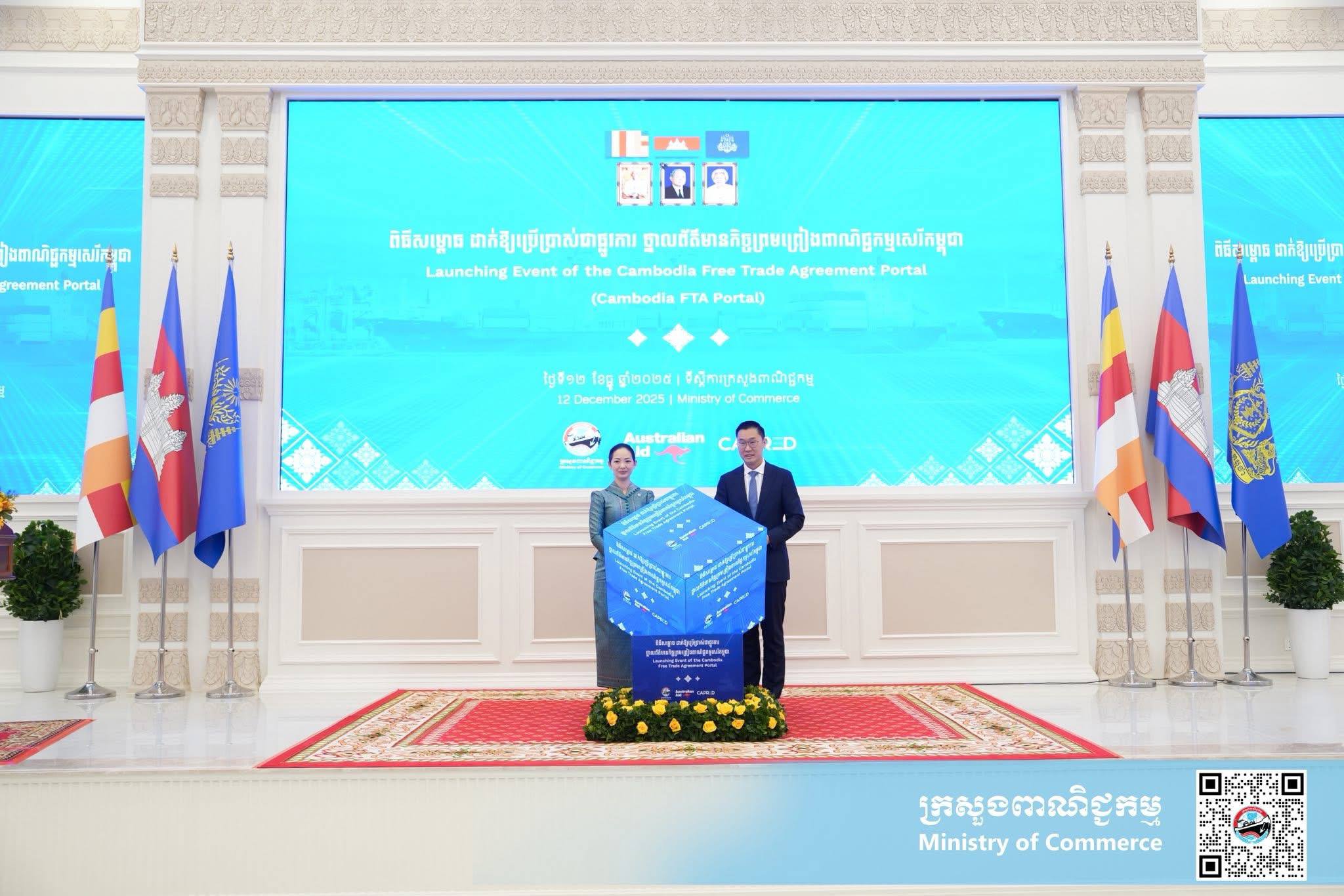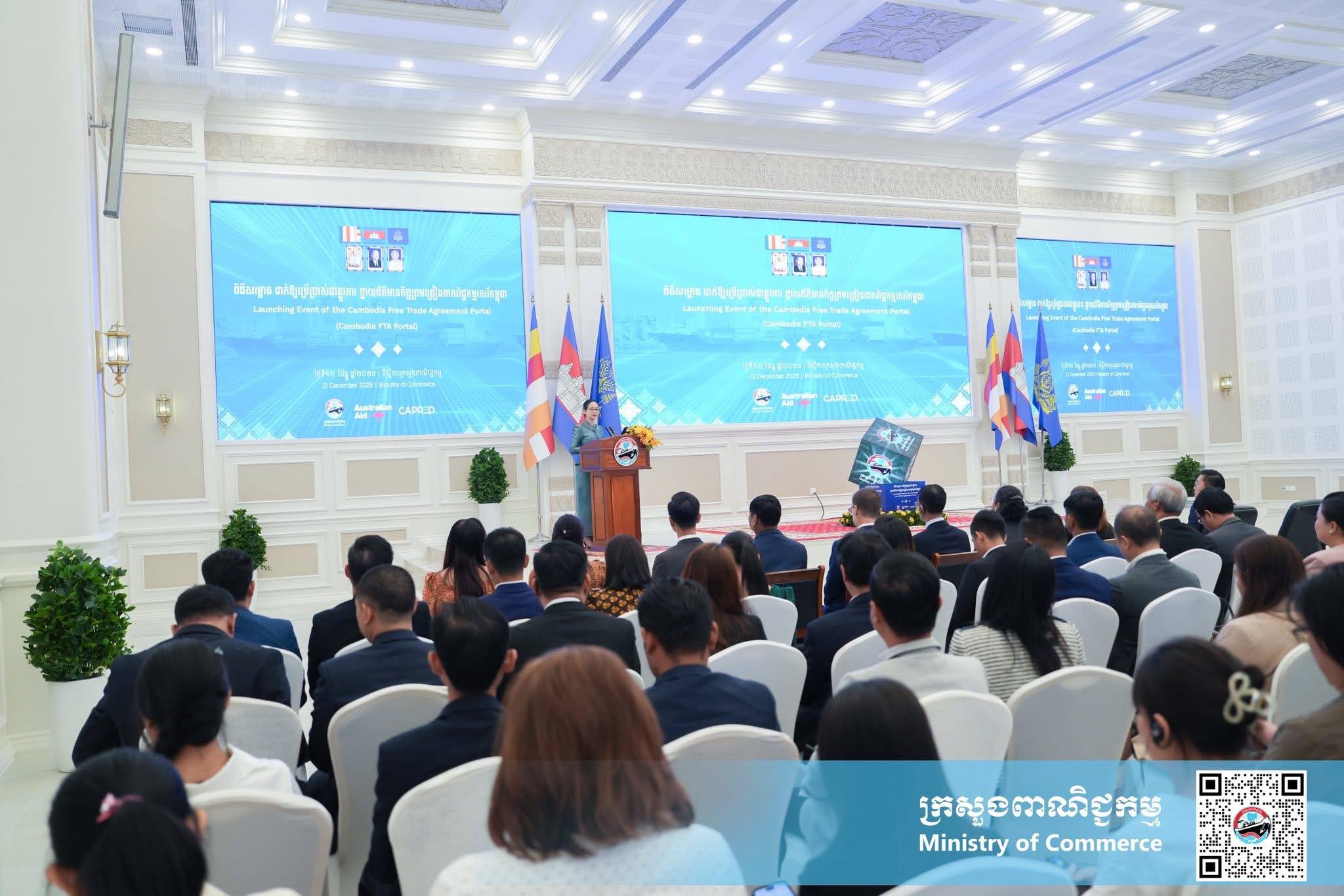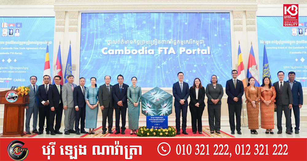 (ភ្នំពេញ)៖ នាព្រឹកថ្ងៃសុក្រ ទី១២ ខែធ្នូ ឆ្នាំ២០២៥ នៅទីស្ដីការក្រសួងពាណិជ្ជកម្ម លោកស្រី ចម និម្មល រដ្ឋមន្ត្រីក្រសួងពាណិជ្ជកម្ម និងលោក ដេរិក យីប ឯកអគ្គរដ្ឋទូត អូស្ត្រាលីប្រចាំនៅកម្ពុជា បានអញ្ជើញជាគណៈអធិបតី ក្នុងពិធីសម្ពោធដាក់ឱ្យប្រើប្រាស់ជាផ្លូវការ ថ្នាលព័ត៌មានកិច្ចព្រមព្រៀងពាណិជ្ជកម្មសេរីកម្ពុជា (Cambodia FTA Portal) ។