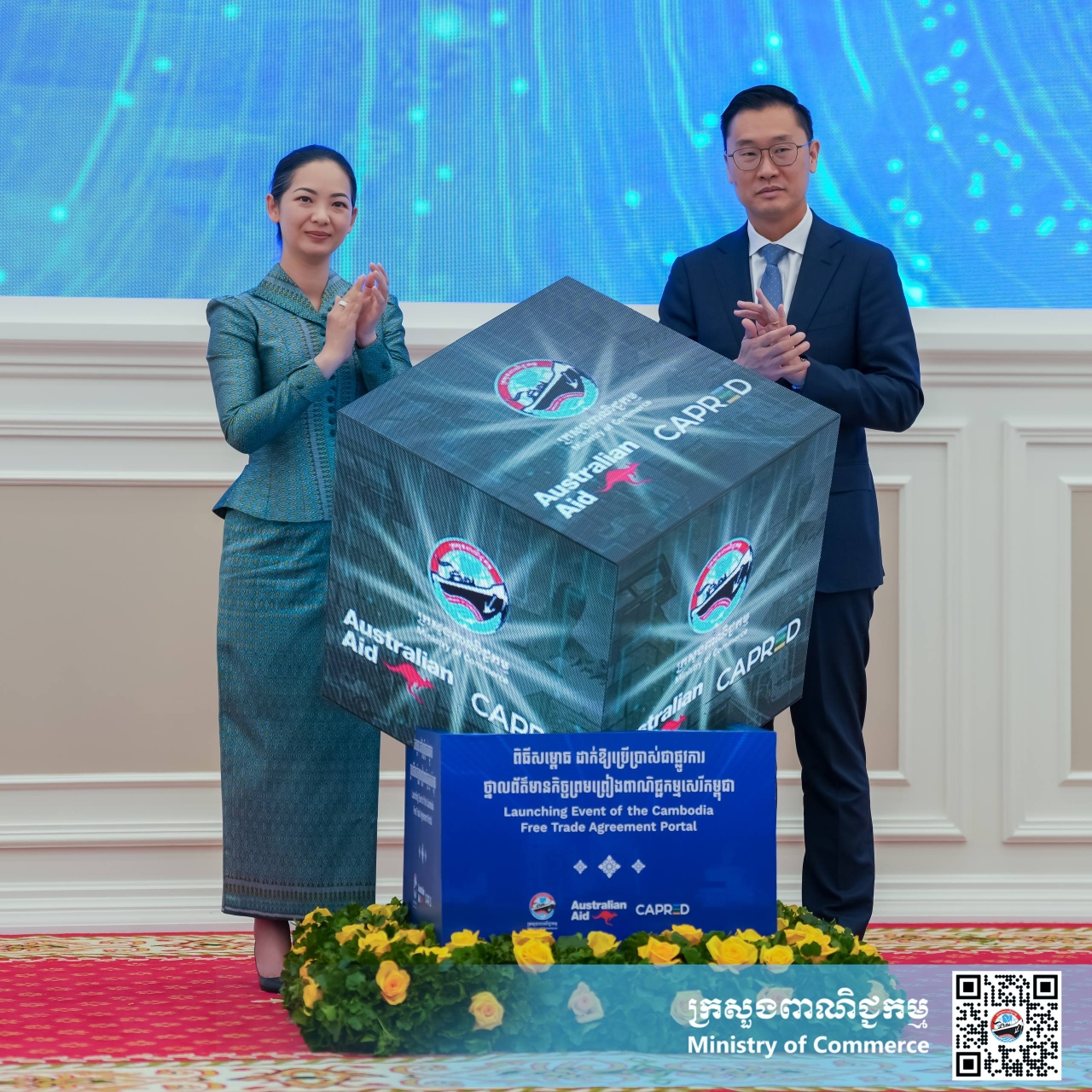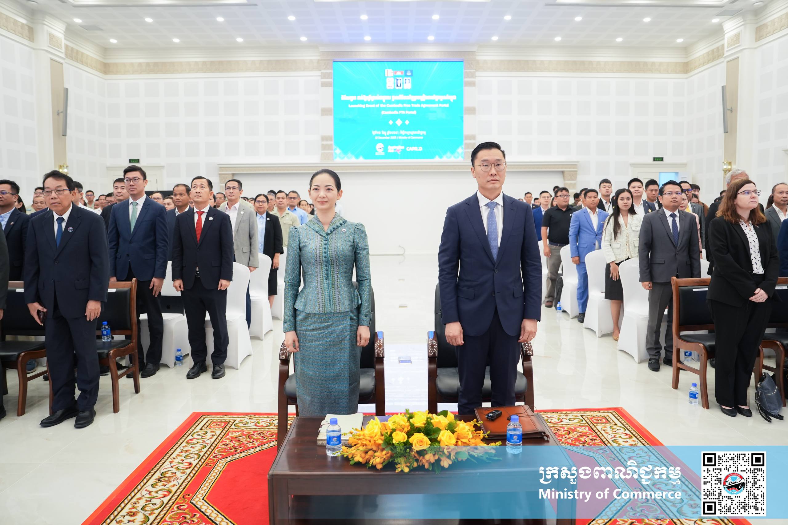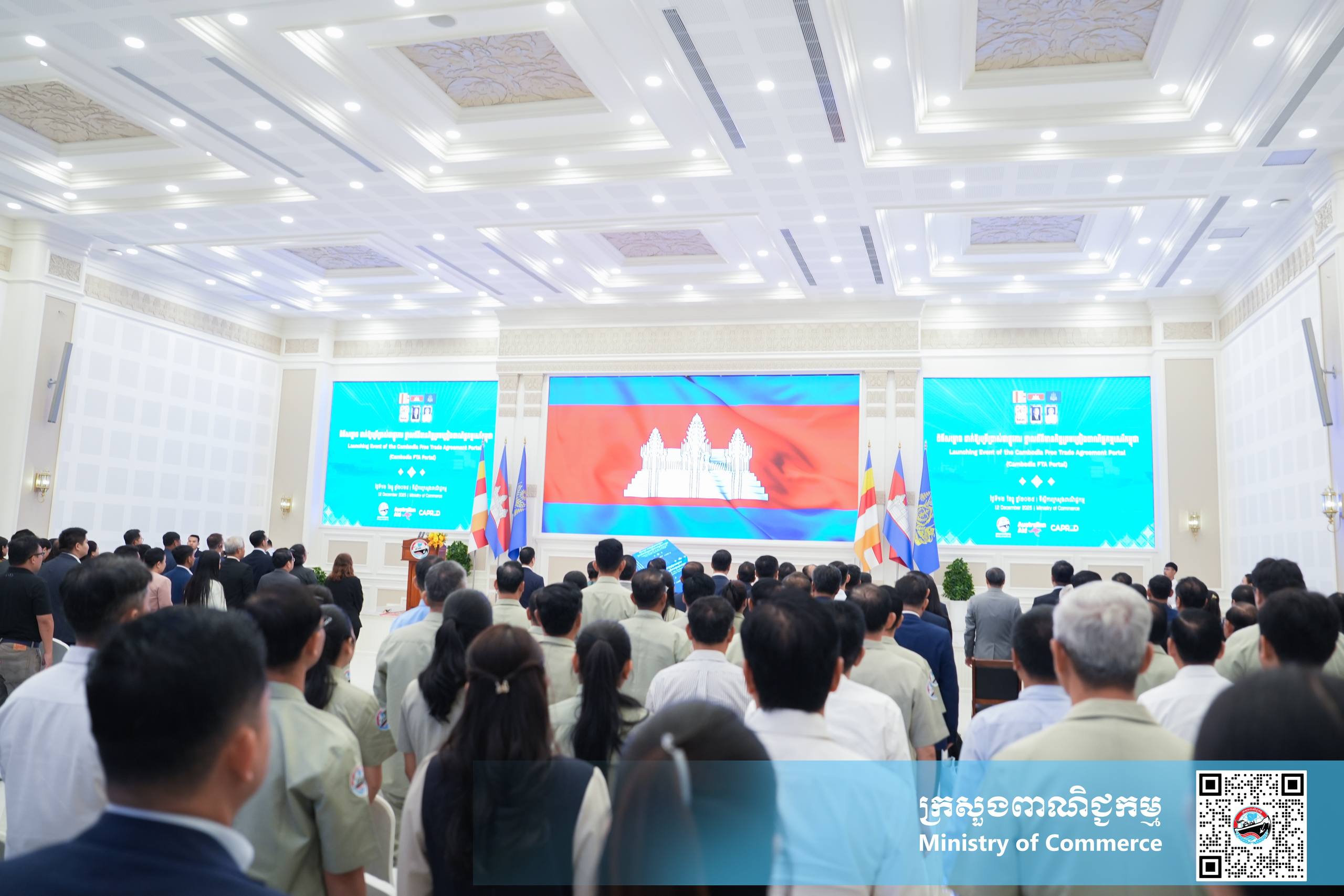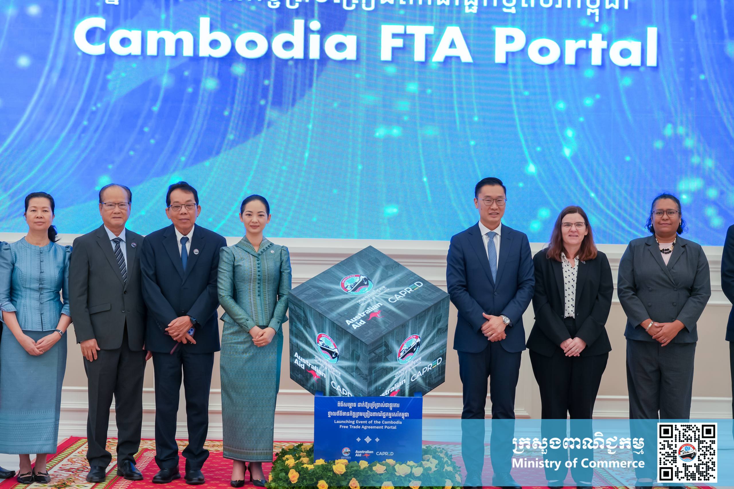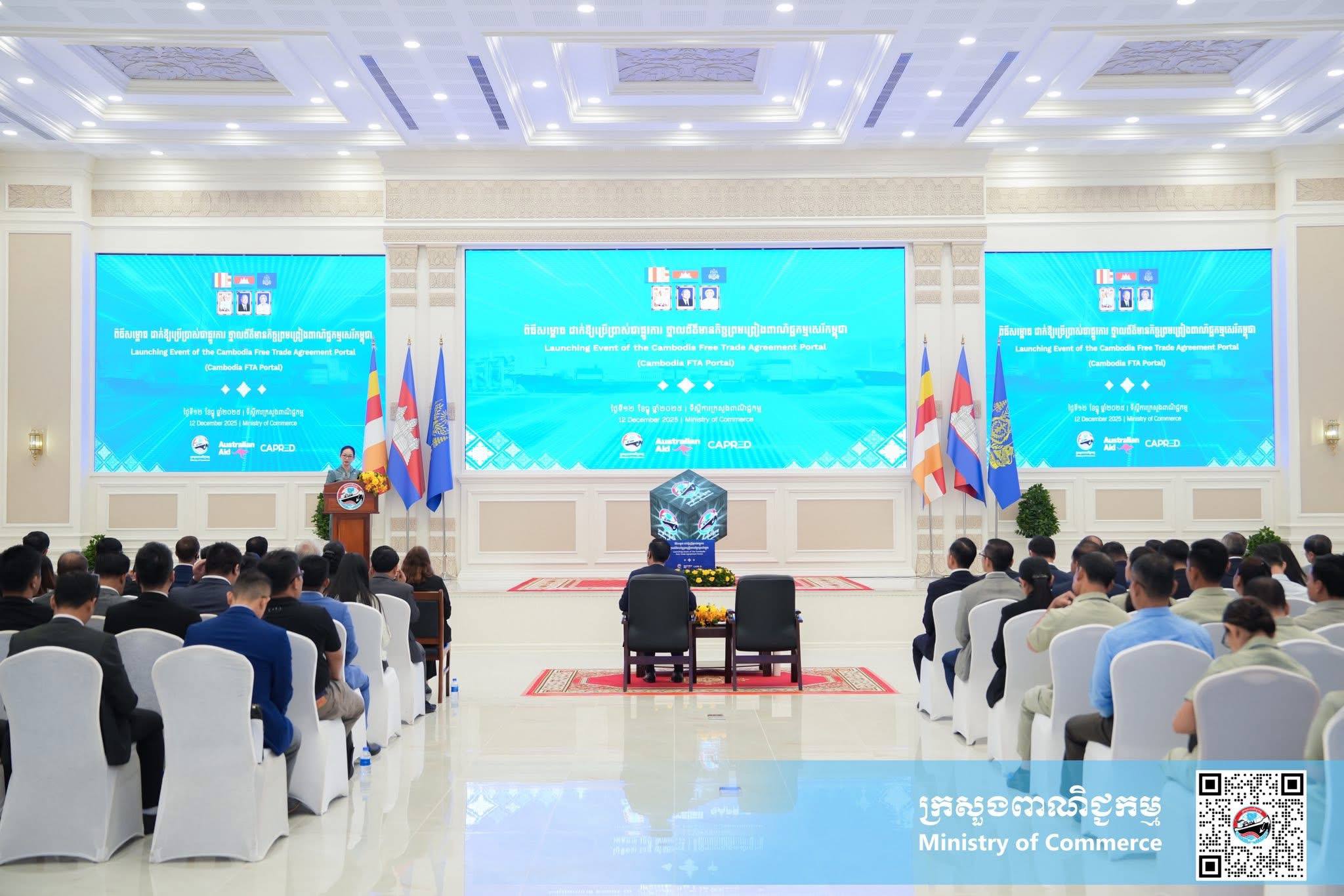 (ភ្នំពេញ)៖ នាព្រឹកថ្ងៃសុក្រ ទី១២ ខែធ្នូ ឆ្នាំ២០២៥ នៅទីស្ដីការក្រសួងពាណិជ្ជកម្ម លោកស្រី ចម និម្មល រដ្ឋមន្ត្រីក្រសួងពាណិជ្ជកម្ម និងលោក ដេរិក យីប ឯកអគ្គរដ្ឋទូត អូស្ត្រាលីប្រចាំនៅកម្ពុជា បានអញ្ជើញជាគណៈអធិបតី ក្នុងពិធីសម្ពោធដាក់ឱ្យប្រើប្រាស់ជាផ្លូវការ ថ្នាលព័ត៌មានកិច្ចព្រមព្រៀងពាណិជ្ជកម្មសេរីកម្ពុជា (Cambodia FTA Portal) ។