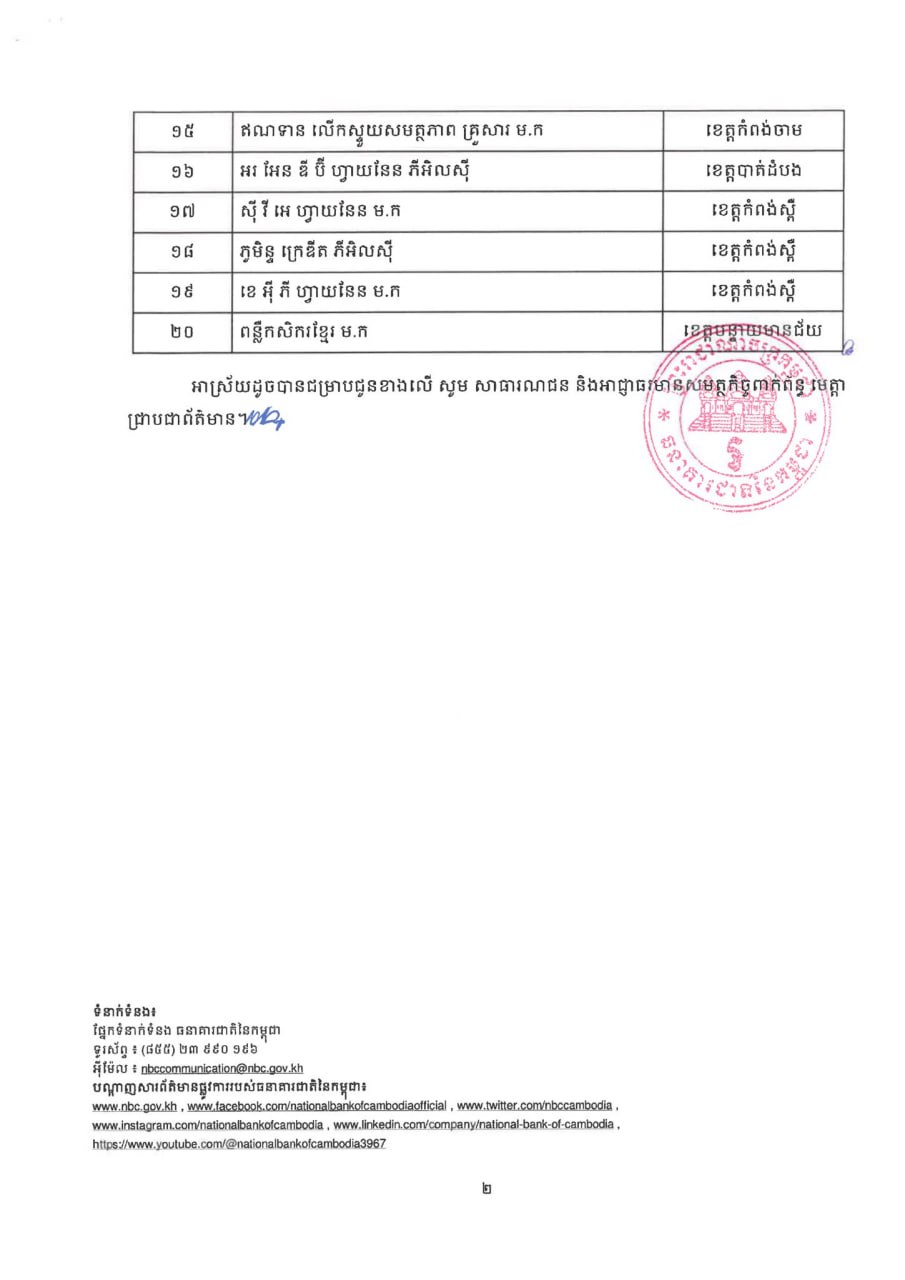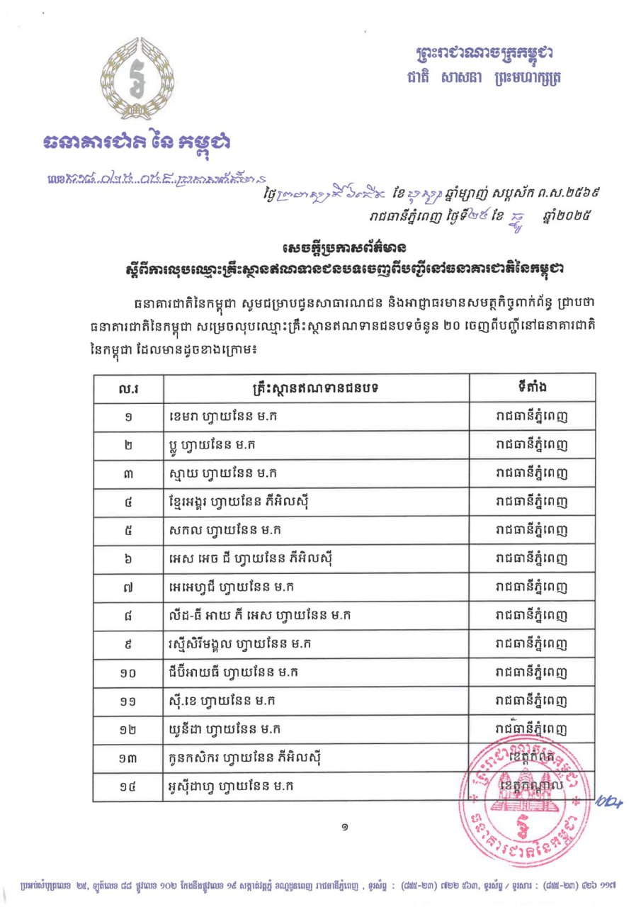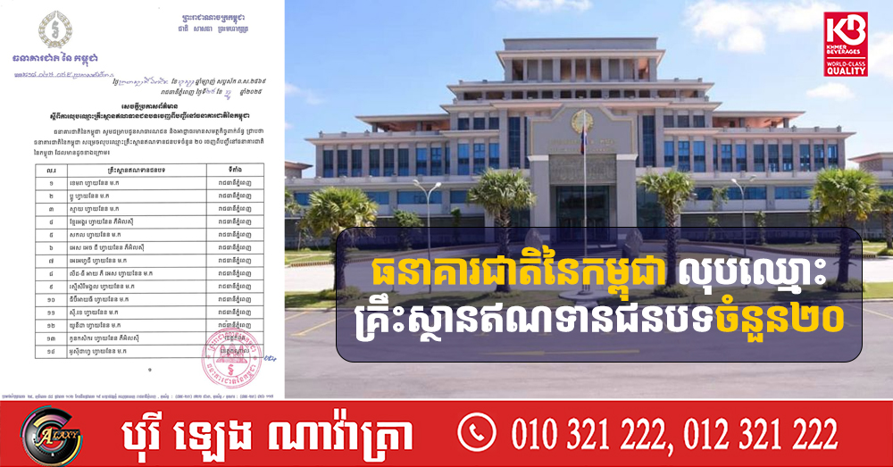 (ភ្នំពេញ)៖ ធនាគារជាតិនៃកម្ពុជា នាថ្ងៃទី២៥ ខែធ្នូ ឆ្នាំ២០២៥នេះ បានសម្រេចលុបឈ្មោះគ្រឹះស្ថានឥណទានជនបទចំនួន២០ ចេញពីបញ្ជី នៅធនាគារជាតិនៃកម្ពុជា។ នេះបើយោងតាមសេចក្តីប្រកាសព័ត៌មានរបស់ធនាគារជាតិ ចេញផ្សាយនៅថ្ងៃទី២៥ ខែធ្នូនេះ។