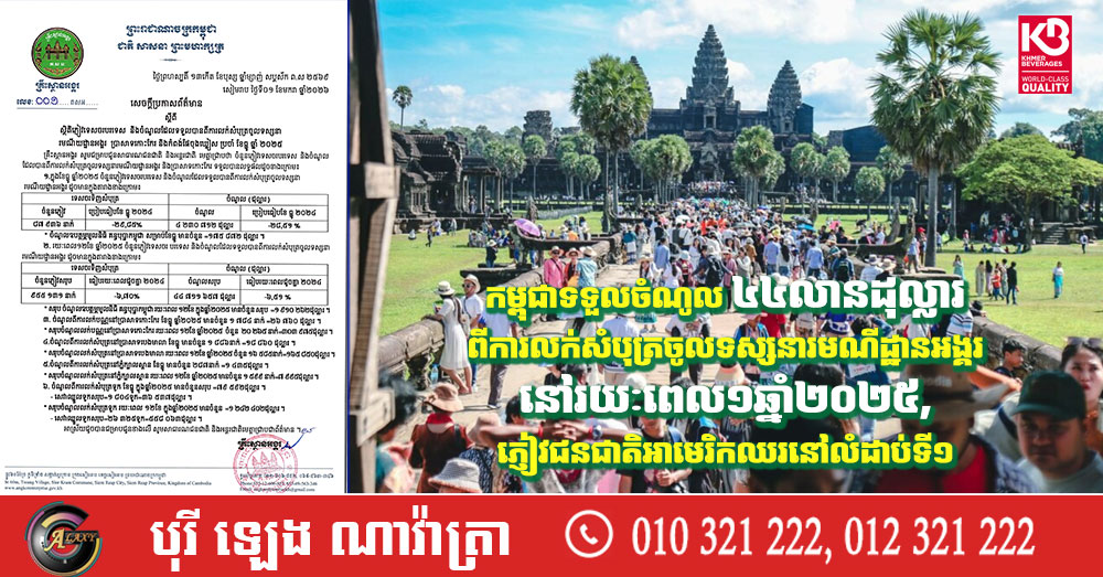 កម្ពុជាទទួលចំណូល៤៤លានដុល្លារពីការលក់សំបុត្រចូលទស្សនារមណីដ្ឋានអង្គរ នៅរយៈពេល១ឆ្នាំ២០២៥, ភ្ញៀវជនជាតិអាមេរិកឈរនៅលំដាប់ទី១ (Video inside)