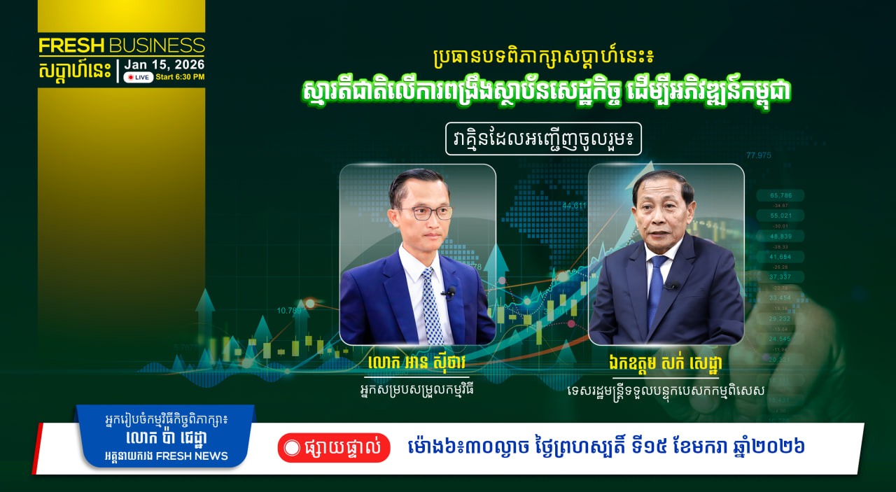 FRESH BUSINESS: កិច្ចពិភាក្សា ស្តីពី «ស្មារតីជាតិលើការពង្រឹងស្ថាប័នសេដ្ឋកិច្ច ដើម្បីអភិវឌ្ឍកម្ពុជា» សូមរង់ចាំទស្សនា នៅល្ងាចថ្ងៃព្រហស្បតិ៍នេះ