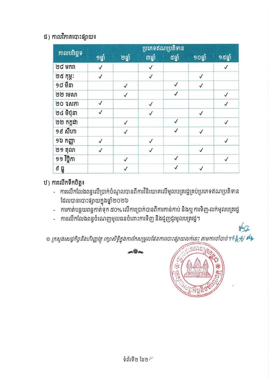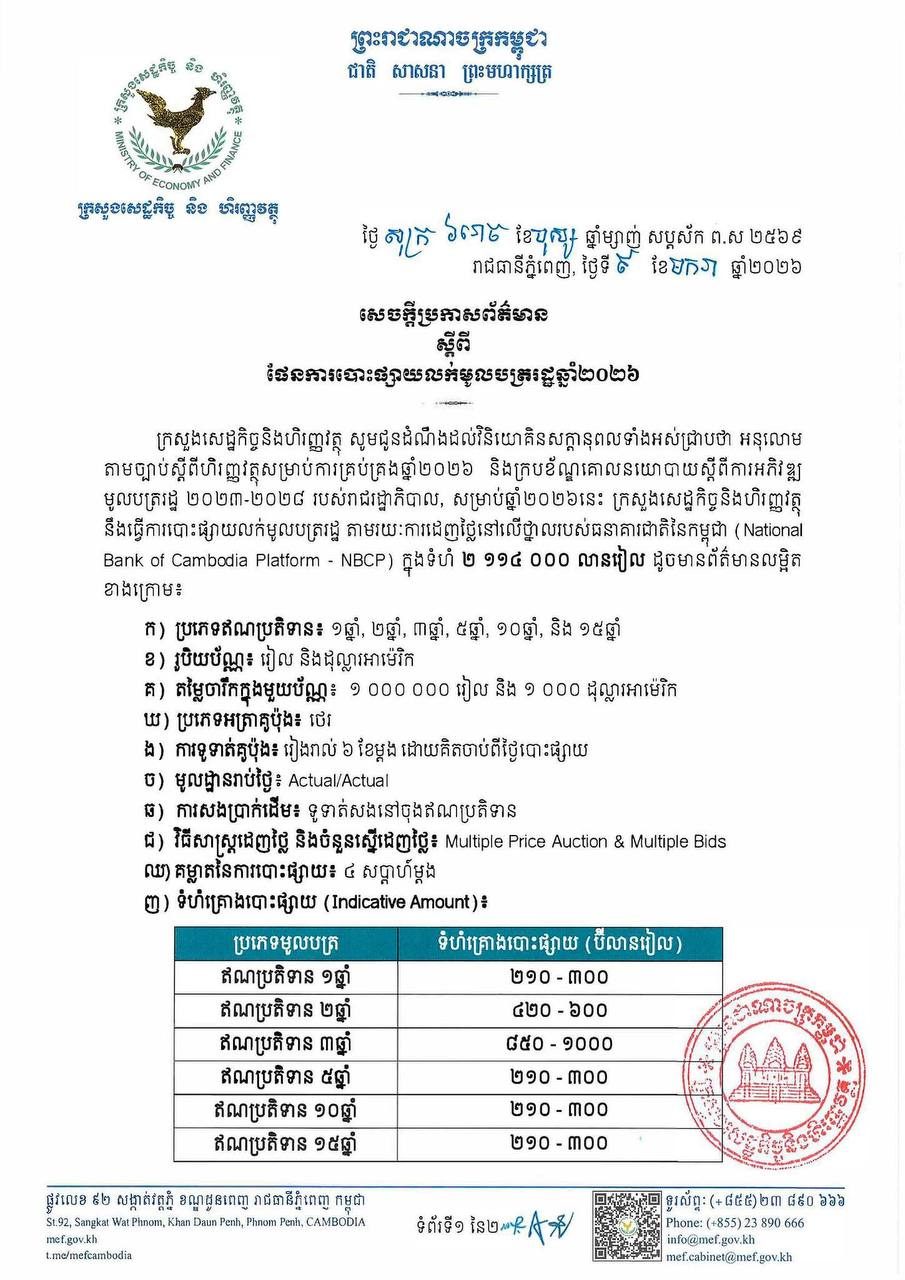 ក្រសួងសេដ្ឋកិច្ច និងហិរញ្ញវត្ថុ ប្រកាសពីការបោះផ្សាយលក់មូលបត្ររដ្ឋ តាមរយៈការដេញថ្លៃ នៅលើថ្នាលធនាគារជាតិនៃកម្ពុជា ក្នុងទំហំជាង ៥០០លានដុល្លារ នៅឆ្នាំ២០២៦