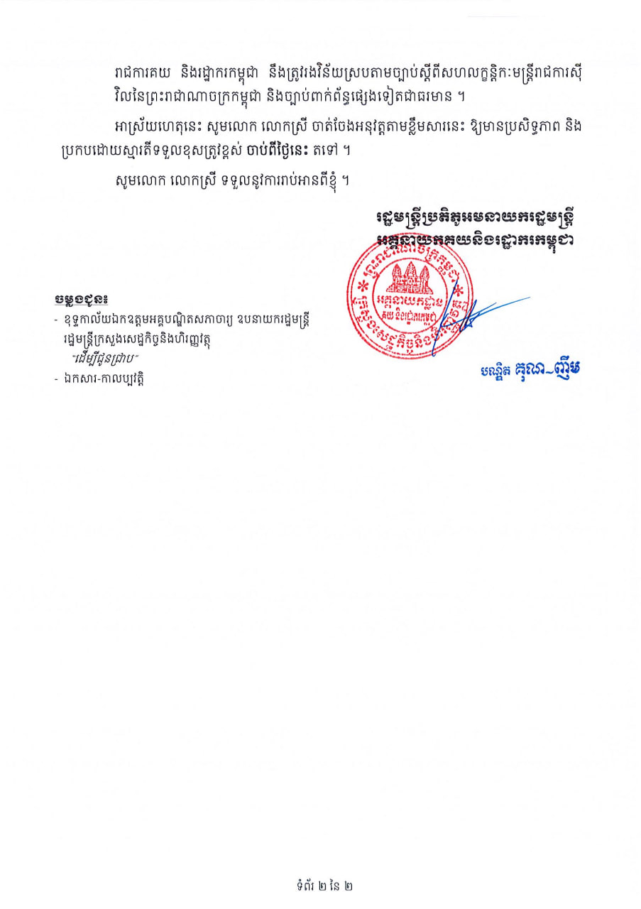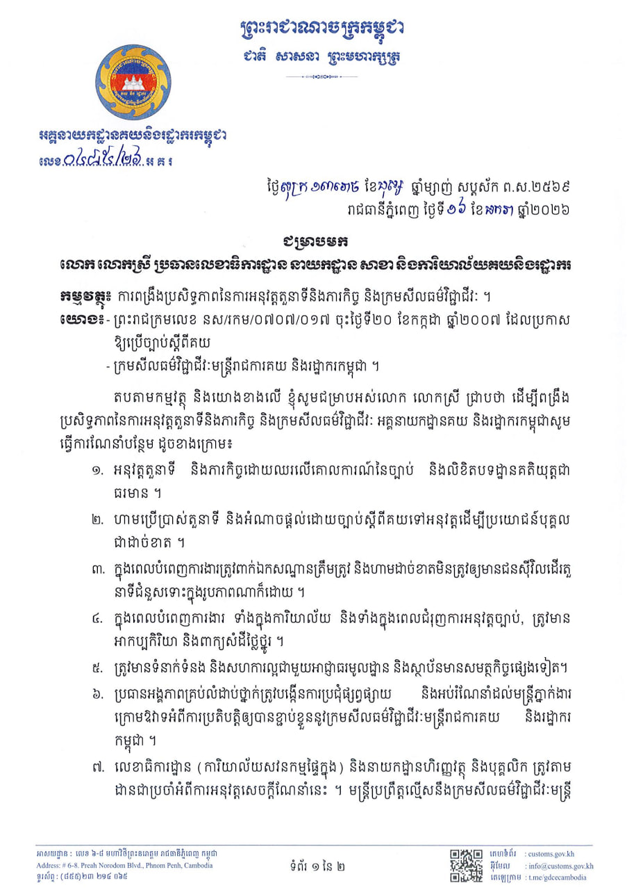 ដើម្បីពង្រឹងប្រសិទ្ធភាពនៃការអនុវត្តតួនាទី និងភារកិច្ច និងក្រមសីលធម៌វិជ្ជាជីវៈ អគ្គនាយកដ្ឋានគយ និងរដ្ឋាករកម្ពុជា សូមធ្វើការណែនាំបន្ថែមដូចខាងក្រោម៖