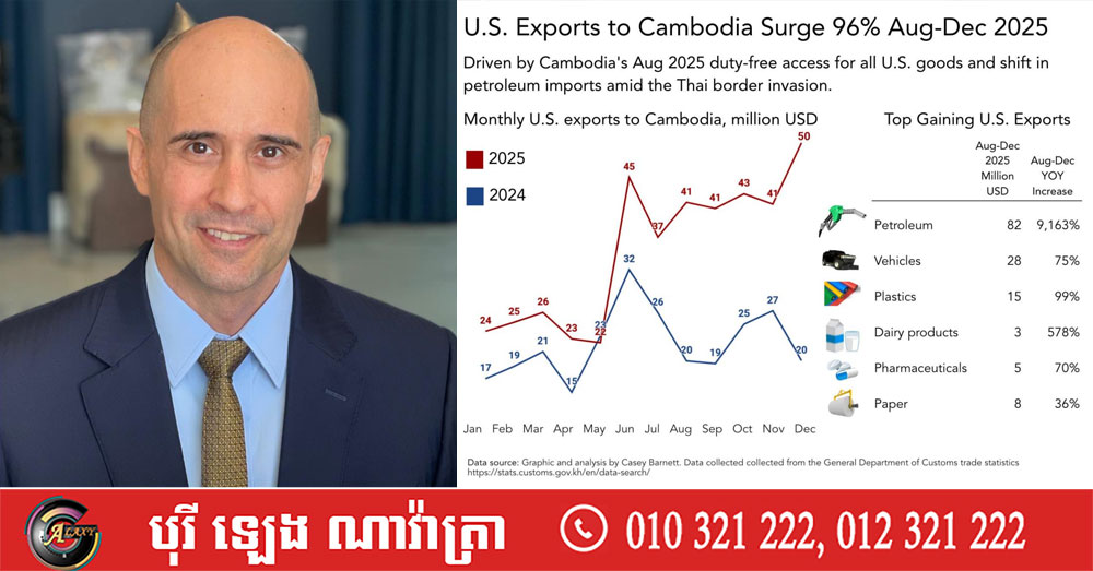 លោក Casey Barnett លើកឡើងថា នៅខែសីហា ឆ្នាំ២០២៥ កម្ពុជាបានផ្តល់សិទ្ធិឱ្យសហរដ្ឋអាមេរិកនាំចេញទំនិញផលិត នៅសហរដ្ឋអាមេរិកទាំងអស់ចូលកម្ពុជា ដោយមិនបង់ពន្ធគយ (duty‑free) ដែលជាការអនុគ្រោះមួយ ដើម្បីកាត់បន្ថយពន្ធគយ «ទៅវិញទៅមក» របស់សហរដ្ឋអាមេរិក។ ដោយសារតែការផ្លាស់ប្តូរនេះ ការនាំចេញរបស់សហរដ្ឋអាមេរិកមកកម្ពុជា បានកើនឡើង ៩៦% បើប្រៀបធៀបនឹងឆ្នាំមុន សម្រាប់រយៈពេលពីខែសីហាដល់ខែធ្នូ។