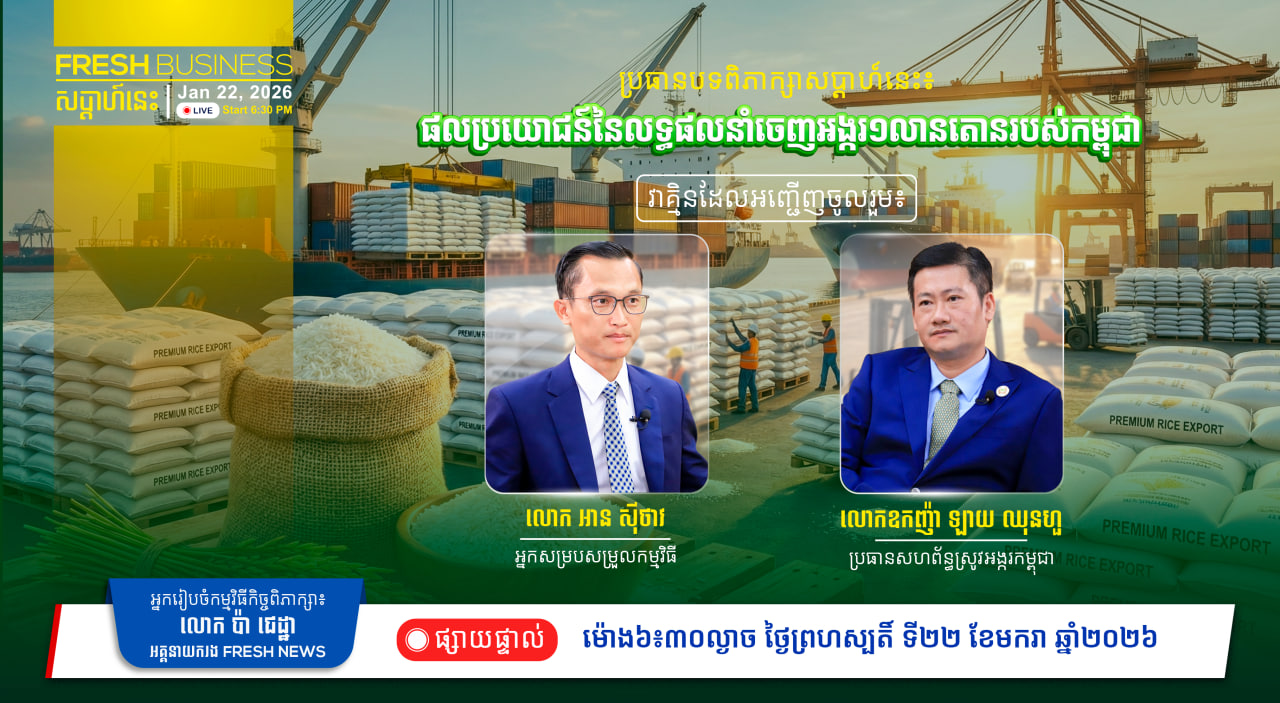 FRESH BUSINESS: កិច្ចពិភាក្សា ស្តីពី «ផលប្រយោជន៍នៃលទ្ធផលនាំចេញអង្ករ១លានតោនរបស់កម្ពុជា» សូមរង់ចាំទស្សនា នៅល្ងាចថ្ងៃព្រហស្បតិ៍សប្តាហ៍នេះ