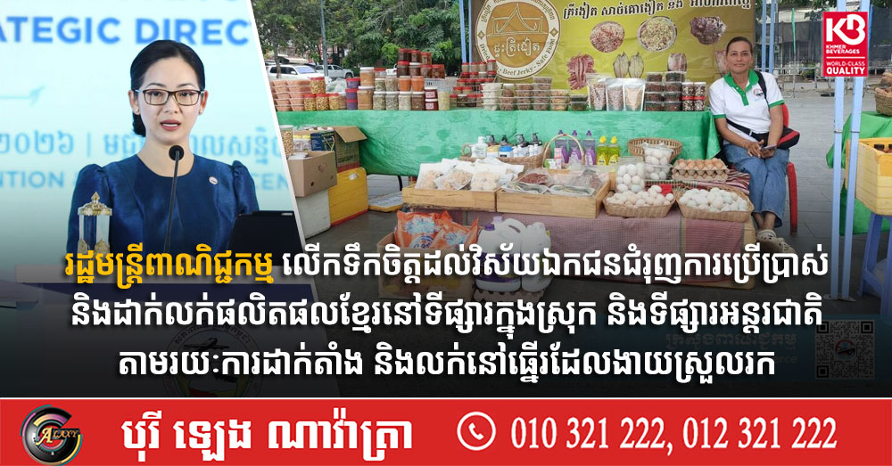 រដ្ឋមន្រ្តីពាណិជ្ជកម្ម លើកទឹកចិត្តដល់វិស័យឯកជនជំរុញការប្រើប្រាស់ និងដាក់លក់ផលិតផលខ្មែរនៅទីផ្សារក្នុងស្រុក និងទីផ្សារអន្តរជាតិ តាមរយៈការដាក់តាំង និងលក់នៅធ្នើរដែលងាយស្រួលរក