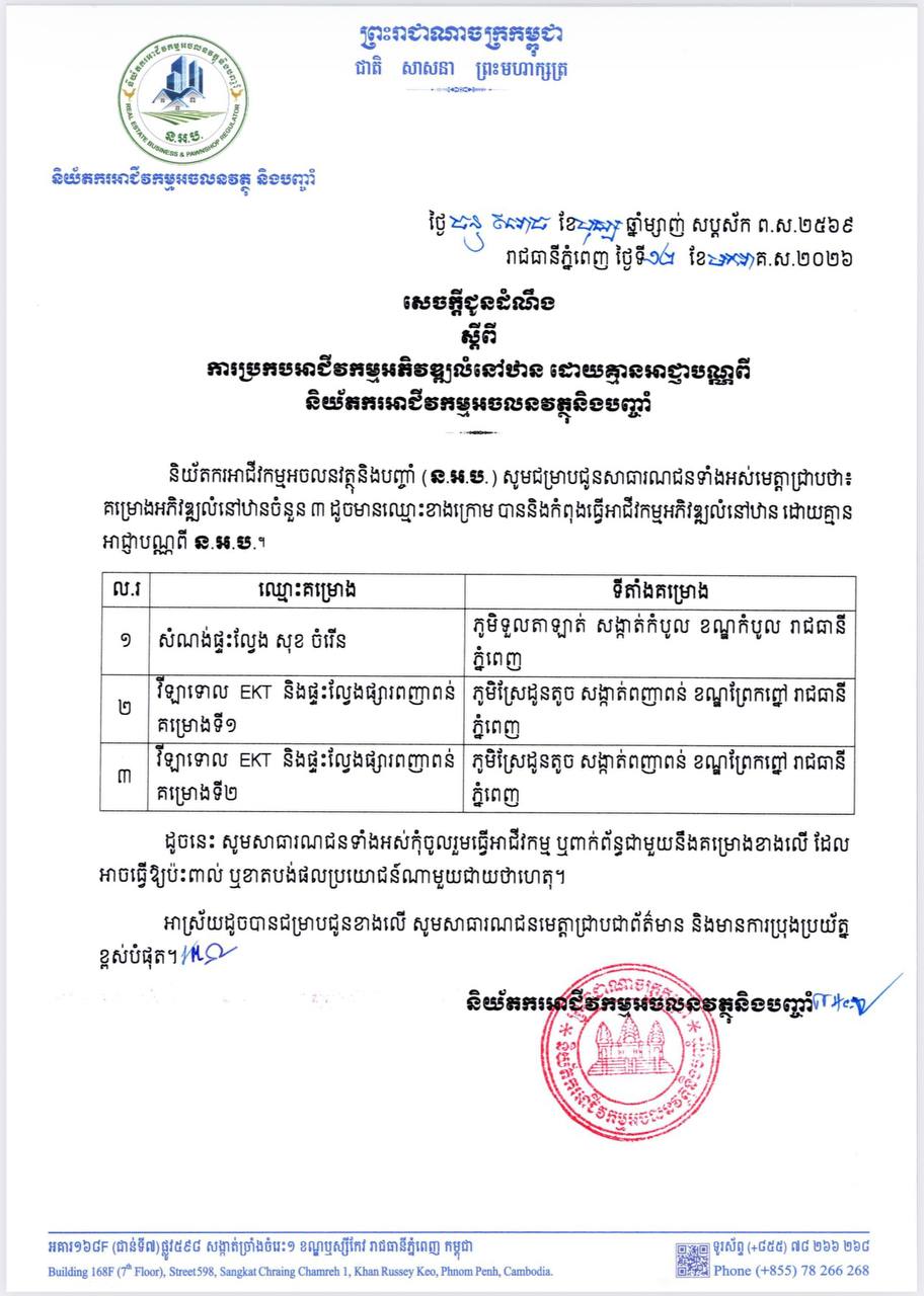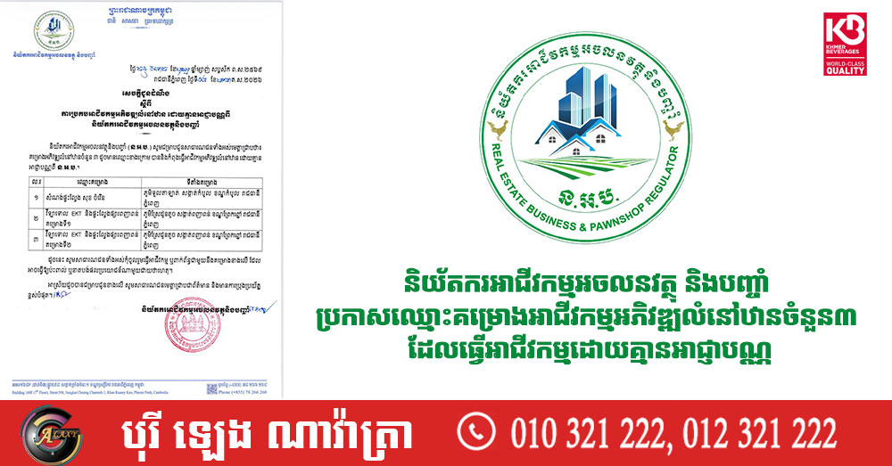 និយ័តករអាជីវកម្មអចលនវត្ថុ និងបញ្ចាំ ប្រកាសឈ្មោះគម្រោងអាជីវកម្មអភិវឌ្ឍលំនៅឋានចំនួន៣ ដែលធ្វើអាជីវកម្មដោយគ្មានអាជ្ញាបណ្ណ