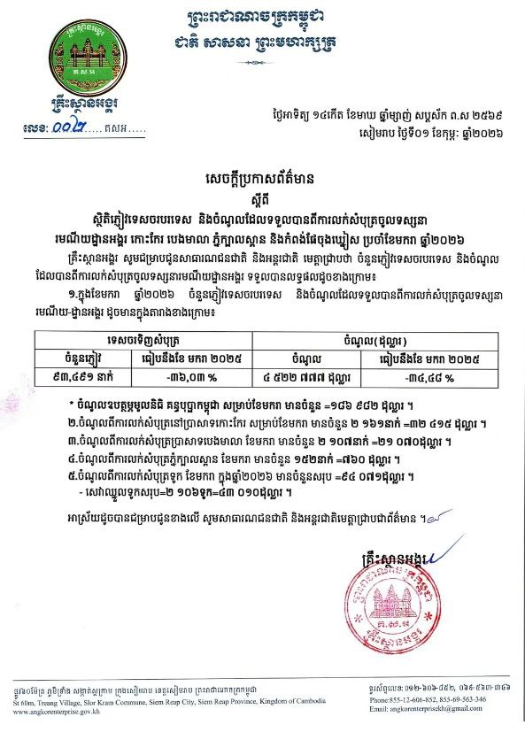 គ្រឹះស្ថានអង្គរបានបញ្ជាក់ថា ក្នុងខែមករា ឆ្នាំ២០២៦នេះ ចំណូលដែលទទួលបានពីការលក់សំបុត្រចូលទស្សនា រមណីយ-ដ្ឋានអង្គរមានចំនួន ៤ ៥២២ ៧៧៧ដុល្លារ ថយចុះ៣៤.៤៨% បើធៀបនឹងខែមករា ឆ្នាំ២០២៥។ ចំណែកចំនួនភ្ញៀវទេសចរបរទេស មានចំនួន ៩៣,៤៩១នាក់ ថយចុះ៣៦.០៣%។