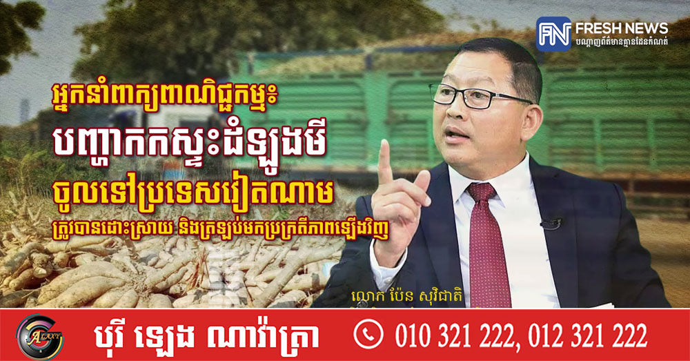 (ភ្នំពេញ)៖ លោក បែន សុវិជាតិ រដ្ឋលេខាធិការ និងជាអ្នកនាំពាក្យក្រសួងពាណិជ្ជកម្ម នៅថ្ងៃទី៣ ខែកុម្ភៈ ឆ្នាំ២០២៦ បានបញ្ជាក់ប្រាប់បណ្ដាញព័ត៌មាន Fresh News ថា បញ្ហាកកស្ទះដំឡូងមីកម្ពុជានាំចូលទៅវៀតណាម តាមច្រកព្រំដែនក្នុងខេត្តត្បូងឃ្មុំ បានត្រឡប់មកប្រក្រតីភាពឡើងវិញ។
