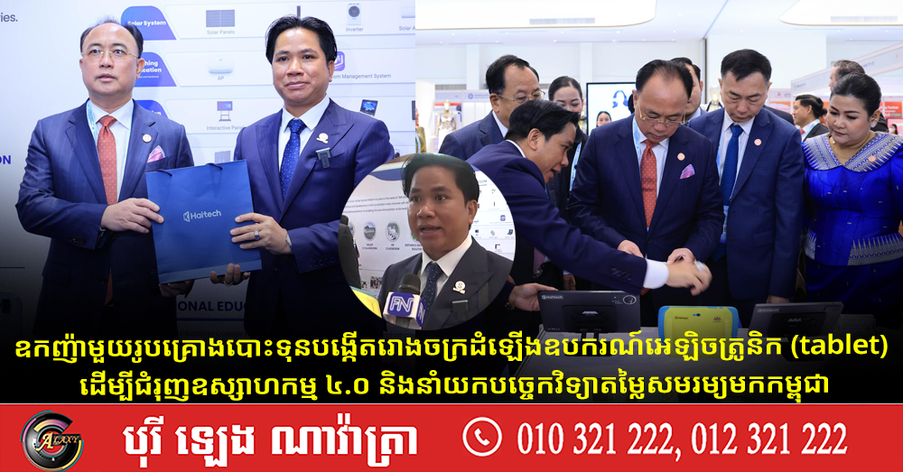 (ភ្នំពេញ)៖ ឧកញ៉ាមួយរូប គ្រោងបោះទុន ប្រមាណ១០លានដុល្លារ បង្កើតរោងចក្រដំឡើងឧបករណ៍អេឡិចត្រូនិក (tablet) ដែលជារោងចក្រដំបូងគេនៅកម្ពុជា ដើម្បីជំរុញឧស្សាហកម្ម ៤.០ និងនាំយកបច្ចេកវិទ្យាតម្លៃសមរម្យមកកម្ពុជា។