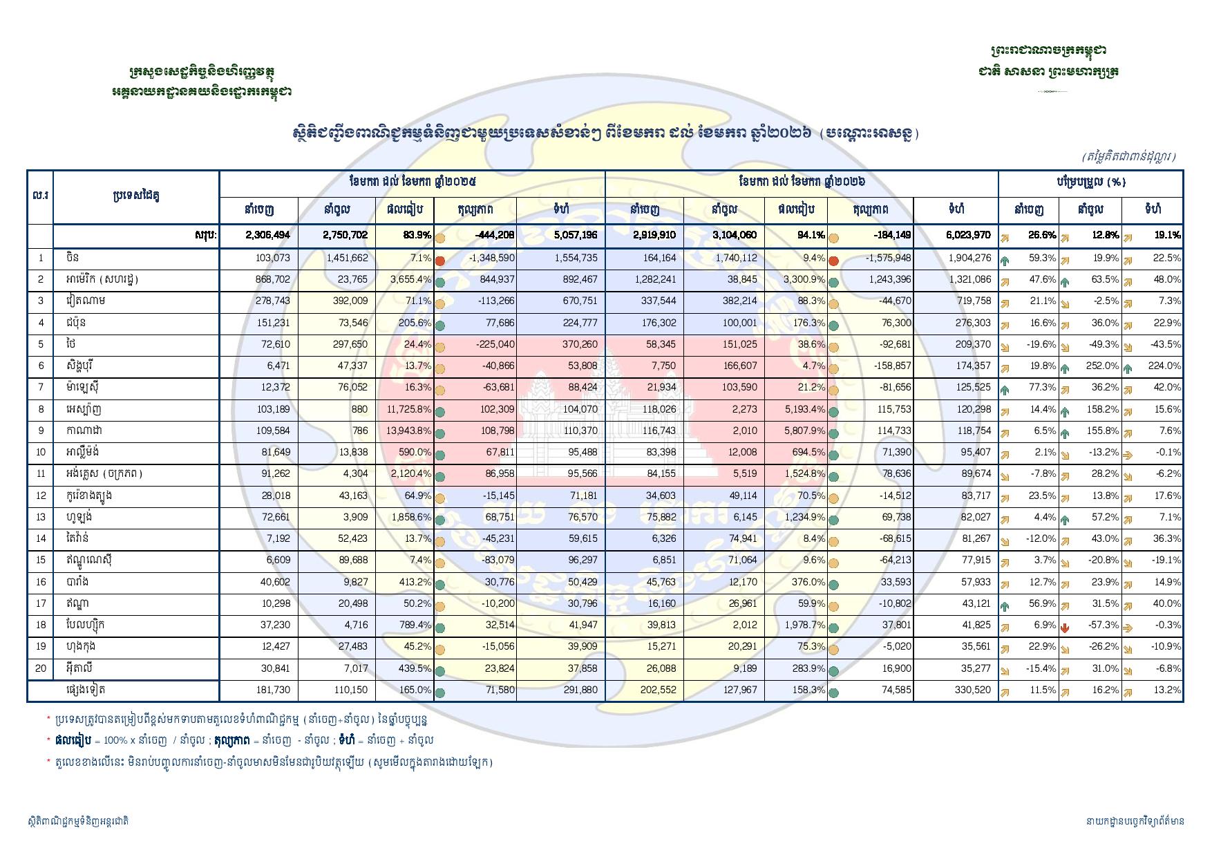 របាយការណ៍បានបញ្ជាក់ថា ក្នុងខែមករា ឆ្នាំ២០២៦ កម្ពុជាបាននាំចេញទំនិញ ក្នុងតម្លៃជាង ២,៩១៩លានដុល្លារ កើនឡើង២៦.៦%។ ចំណែកការនាំចូលទំនិញមកវិញមានតម្លៃ ៣,១០៤លានដុល្លារ កើនឡើង១២.៨% បើធៀបនឹងរយៈពេលដូចគ្នា កាលឆ្នាំ២០២៥។