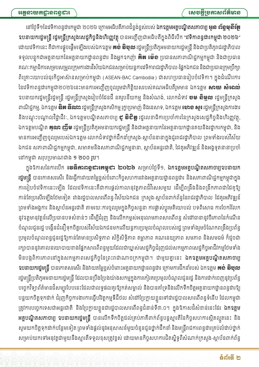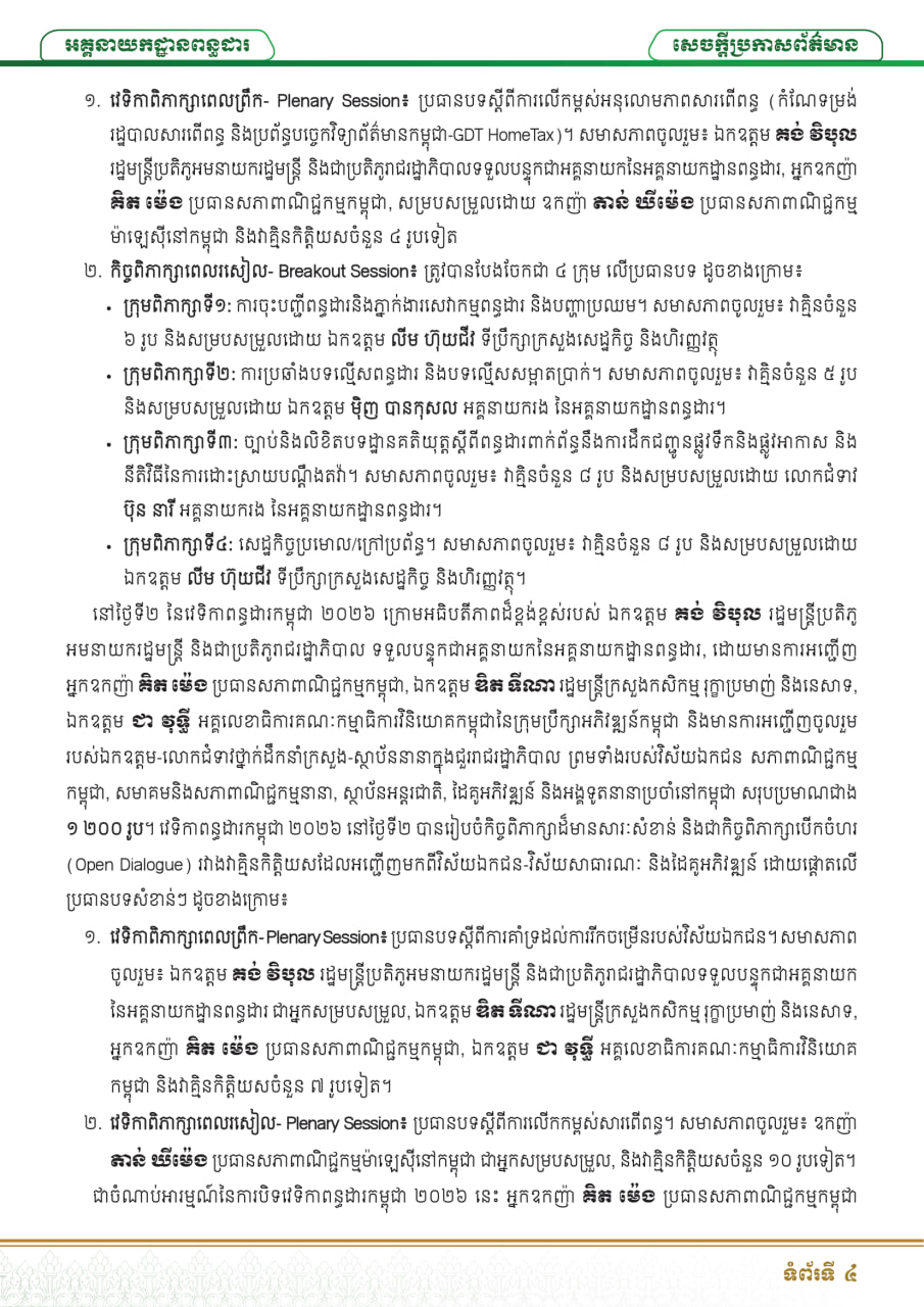 នៅថ្ងៃទី១នៃវេទិកាពន្ធដារកម្ពុជា ២០២៦ ក្រោមអធិបតីភាពរបស់ អគ្គបណ្ឌិតសភាចារ្យ អូន ព័ន្ធមុនីរ័ត្ន ឧបនាយករដ្ឋមន្ត្រី រដ្ឋមន្ត្រីក្រសួងសេដ្ឋកិច្ចនិងហិរញ្ញវត្ថុ បានអញ្ជើញជាអធិបតីក្នុងពិធីបើក “វេទិកាពន្ធដារកម្ពុជា ២០២៦” ដោយវេទិកានេះ គឺជាការផ្តួចផ្តើមឡើងរបស់លោក គង់ វិបុល រដ្ឋមន្រ្តីប្រតិភូអមនាយករដ្ឋមន្រ្តី និងជាអគ្គនាយកនៃអគ្គនាយកដ្ឋានពន្ធដារ និងអ្នកឧកញ៉ា គិត ម៉េង ប្រធានសភាពាណិជ្ជកម្មកម្ពុជា និងជាប្រធានគណៈកម្មាធិការសម្របសម្រួល ក្រុមការងារវិស័យឯកជនសម្រាប់យន្តការវេទិការាជរដ្ឋាភិបាល-ផ្នែកឯកជន និងជាប្រធានក្រុមប្រឹក្សា ពិគ្រោះយោបល់ធុរកិច្ចអាស៊ានសម្រាប់កម្ពុជា (ASEAN-BAC Cambodia) ជាសហប្រធានរៀបចំវេទិកា។