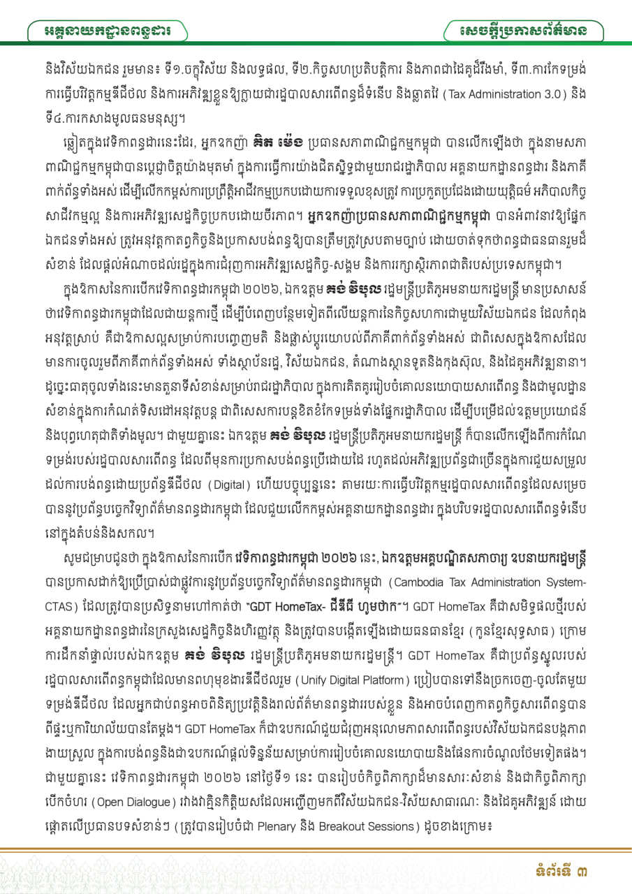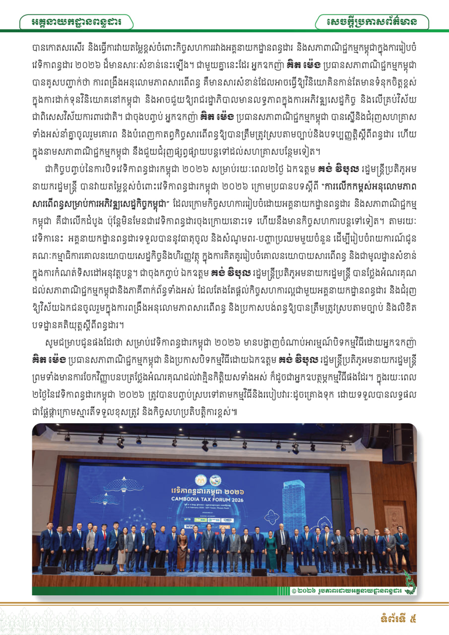 (ភ្នំពេញ)៖ អគ្គនាយដ្ឋានពន្ធដារ នៃក្រសួងសេដ្ឋកិច្ចនិងហិរញ្ញវត្ថុ និងសភាពាណិជ្ជកម្មកម្ពុជា នៅថ្ងៃទី៥-៦ ខែកុម្ភៈ ឆ្នាំ២០២៦ បានរៀបចំវេទិកាពន្ធដារកម្ពុជា ២០២៦ (Cambodia Tax Forum 2026) ក្រោមប្រធានបទស្តីពី «ការលើកកម្ពស់អនុលោមភាពសារពើពន្ធ សម្រាប់ការអភិវឌ្ឍសេដ្ឋកិច្ចកម្ពុជា» នៅទីស្នាក់ការកណ្តាលនៃអគ្គនាយកដ្ឋានពន្ធដារ (GDT Tower)។
