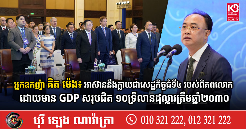 (ភ្នំពេញ)៖ អ្នកឧកញ៉ា គិត ម៉េង ប្រធានសភាពាណិជ្ជកម្មកម្ពុជា និងជាប្រធានក្រុមប្រឹក្សាពិគ្រោះយោបល់ធុរកិច្ចអាស៊ាន-កម្ពុជា បានគូសបញ្ជាក់ថា អាស៊ាននឹងក្លាយជាសេដ្ឋកិច្ចធំ ទីបួនរបស់ពិភពលោក ដោយមានផលិតផលក្នុងស្រុកសរុប (GDP) សរុបជិត១០ទ្រីលានដុល្លារអាមេរិក ត្រឹមឆ្នាំ២០៣០។