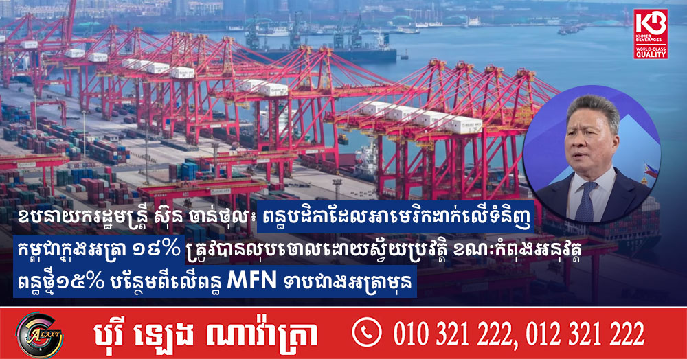 ឧបនាយករដ្ឋមន្ត្រី ស៊ុន ចាន់ថុល៖ ពន្ធបដិកាដែលអាមេរិកដាក់លើទំនិញកម្ពុជាក្នុងអត្រា ១៩% ត្រូវបានលុបចោលដោយស្វ័យប្រវត្តិ ខណៈកំពុងអនុវត្តពន្ធថ្មី១៥% បន្ថែមពីលើពន្ធ MFN ទាបជាងអត្រាមុន (Video inside)