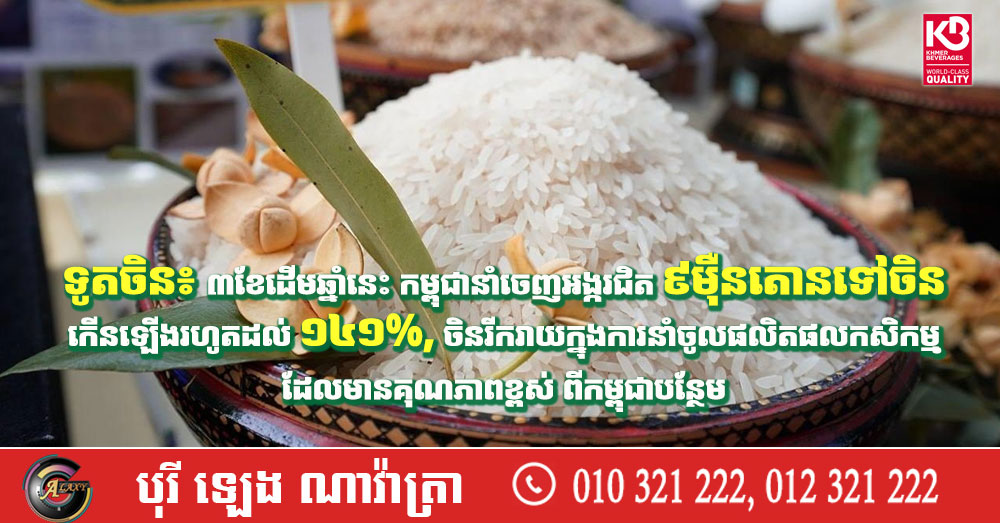 ទូតចិន៖ ៣ខែដើមឆ្នាំនេះ កម្ពុជានាំចេញអង្ករជិត៩ម៉ឺនតោនទៅចិន កើនឡើងរហូតដល់ ១៤១%, ចិនរីករាយក្នុងការនាំចូលផលិតផលកសិកម្ម ដែលមានគុណភាពខ្ពស់ ពីកម្ពុជាបន្ថែម