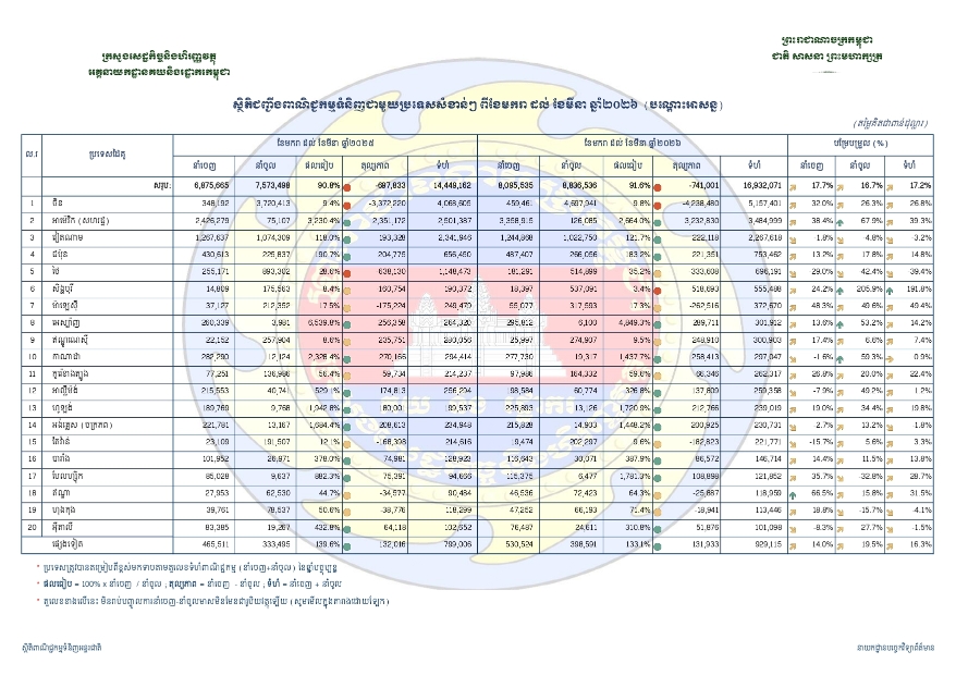 របាយការណ៍បន្ថែមថា រយៈពេល៣ខែដំបូងឆ្នាំនេះ កម្ពុជាបាននាំចេញមានទឹកប្រាក់ ៨ ០៩៥ ៥៣៥ ០០០ដុល្លារ កើន ១៧.៧% បើធៀបនឹងរយៈពេលដូចគ្នាឆ្នាំ២០២៥ មានចំនួន ៦ ៨៧៥ ៦៦៥ ០០០ ដុល្លារ។ ចំណែកការនាំចូលវិញមានទឹកប្រាក់ ៨ ៨៣៦ ៥៣៦ ០០០ដុល្លារ កើន១៦.៧% បៀបនឹងឆ្នាំ២០២៥ ចំនួន ៧ ៥៧៣ ៤៩៨ ០០០ដុល្លារ។