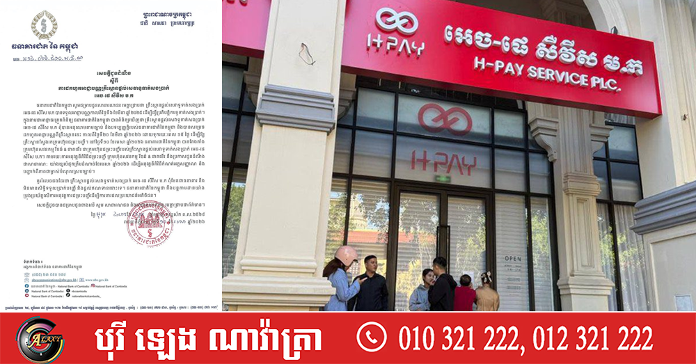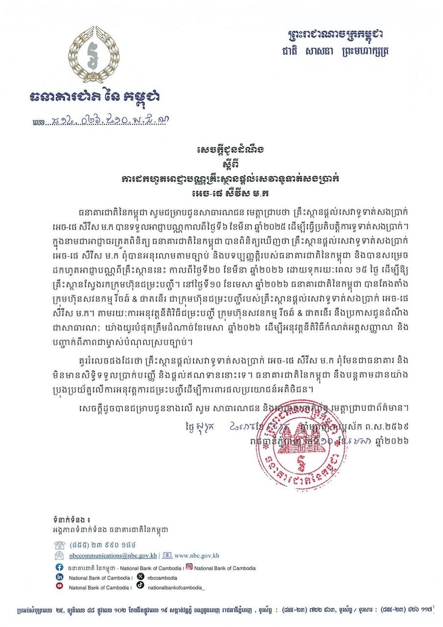 ធនាគារជាតិនៃកម្ពុជា សម្រេចដកហូតអាជ្ញាបណ្ណគ្រឹះស្ថានផ្តល់សេវាទូទាត់សងប្រាក់អេច-ផេ សឺវីស ម.ក ព្រោះពុំបានអនុលោមតាមច្បាប់ និងបទប្បញ្ញត្តិរបស់ធនាគារជាតិ