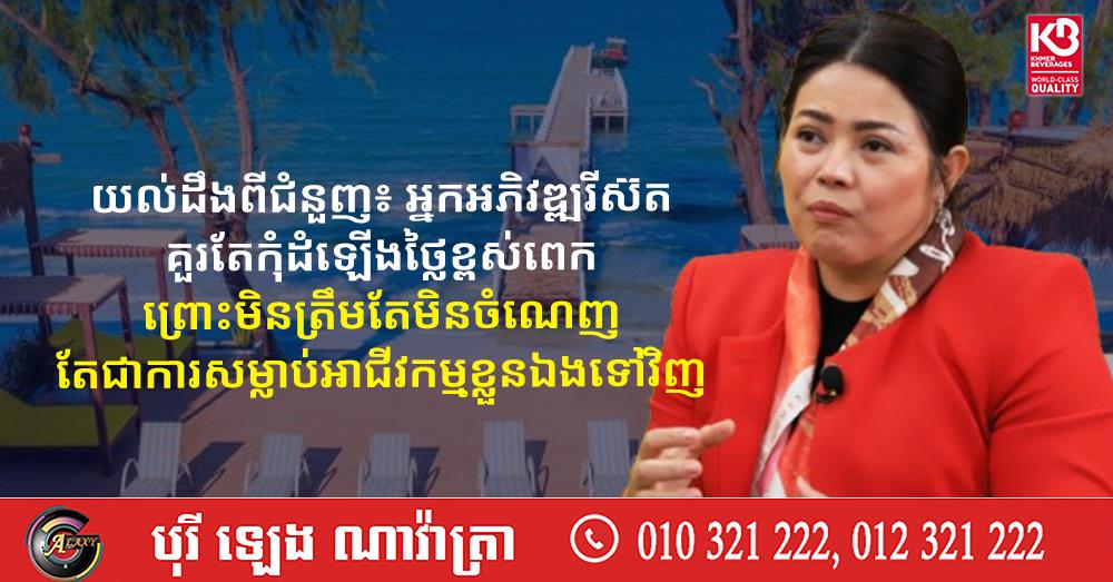 លោកស្រីទទួលស្គាល់ថា ការណ៍ដែលអ្នកអភិវឌ្ឍន៍ភាគច្រើន ដំឡើងខ្ពស់បែបនេះ ដោយសារ រ៊ីសត មានលក្ខណៈខុសពីគេ ខណៈប្រាក់កម្ចីដែលយកមកអភិវឌ្ឍន៍មានអត្រាប្រាក់ខ្ពស់ តម្លៃពលកម្មខ្ពស់ ស្របពេលបរិមាណភ្ញៀវចូលតិច ដែលទាមទារឱ្យពួកគេត្រូវតែដាក់តម្លៃខ្ពស់ ដើម្បីអាចចំណេញបាន។ តែយ៉ាងណា លោកស្រី មើលឃើញថា ការដំឡើងថ្លៃខ្ពស់បែបនេះ មិនត្រឹមតែមិនទទួលបានផលចំណេញនោះទេ តែជាការឈានទៅសម្លាប់អាជីវកម្មរបស់ខ្លួនទៅវិញទេ៕