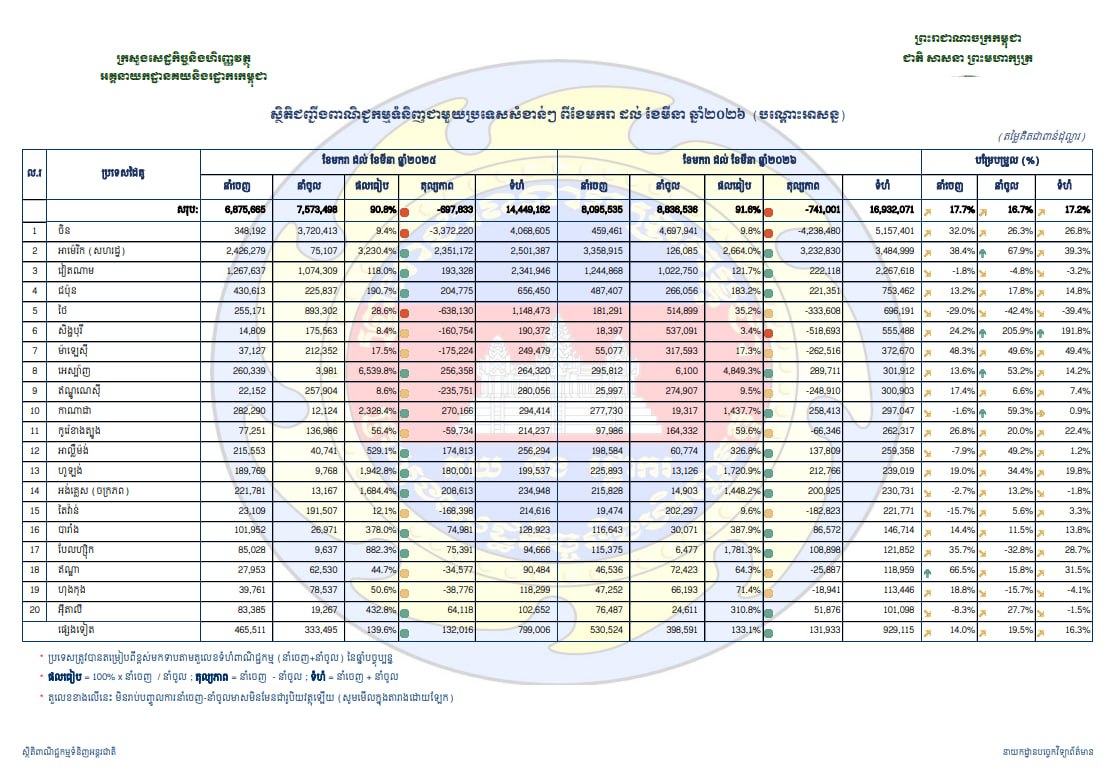 យោងតាមរបាយការណ៍ពីអគ្គនាយកដ្ឋានគយ និងរដ្ឋាករកម្ពុជា បានបង្ហាញថា ៣ខែដើមឆ្នាំ២០២៦នេះ សិង្ហបុរីបាននាំចូលទំនិញមកកម្ពុជាក្នុងទំហំទឹកប្រាក់ជាង ៥៣៧លានដុល្លារ កើនឡើង ២០៥.៩% បើធៀបនឹងរយៈពេលដូចគ្នាកាលពីឆ្នាំមុន ស្របពេលកម្ពុជានាំចេញទៅសិង្ហបុរីវិញមានទំហំទឹកប្រាក់ ជាង១៨លានដុល្លារ កើនឡើង ២៤.២%។ កំណើនបានជំរុញឱ្យទំហំពាណិជ្ជកម្មរបស់ប្រទេសទាំងពីរ សម្រេចបានជាង៥៥៥លានដុល្លារ កើនឡើង១៩១.៨%។