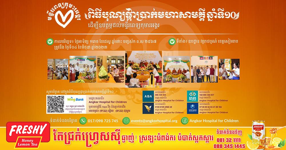 (សៀមរាប)៖ ចាប់តាំងពីឆ្នាំ២០១៣មកដល់បច្ចុប្បន្ននេះ ក្រោមព្រះអធិបតីភាពសម្តេចព្រះព្រហ្មរតនមុនី ពិន សែម គណៈមហានិកាយនៃព្រះរាជាណាចក្រកម្ពុជា និងជាព្រះគ្រូចៅអធិការវត្តរាជបូណ៌ ក្រុងសៀមរាប ព្រមទាំងព្រះថេរានុត្ថេរៈគ្រប់ជាន់ថ្នាក់ ពុទ្ធបរិស័ទ បណ្តាស្ថាប័ន និងក្រុមហ៊ុននានា រួមទាំងក្រុមប្រឹក្សាភិបាល ក្រុមទីប្រឹក្សា គណៈគ្រប់គ្រង និងបុគ្គលិកទាំងអស់នៃមន្ទីរពេទ្យកុមារអង្គរ បានមូលមតិគ្នាជាឯកច្ឆន្ទនឹងប្រារព្ធពិធីបុណ្យផ្កាប្រាក់មហាសាមគ្គីឆ្នាំទី១០ នាថ្ងៃទី៤ ខែមិថុនា ឆ្នាំ២០២៣ នៅវត្តរាជបូណ៌ ក្រុងសៀមរាប ដើម្បីរៃអង្គាសថវិកាសម្រាប់ទ្រទ្រង់ដល់ដំណើរការប្រតិបត្តិនៃមន្ទីរពេទ្យកុមារអង្គរក្នុងការផ្តល់សេវាថែទាំ និងព្យាបាលដោយឯកទេសនិងទូទៅដល់កុមារនៅទូទាំងកម្ពុជា។