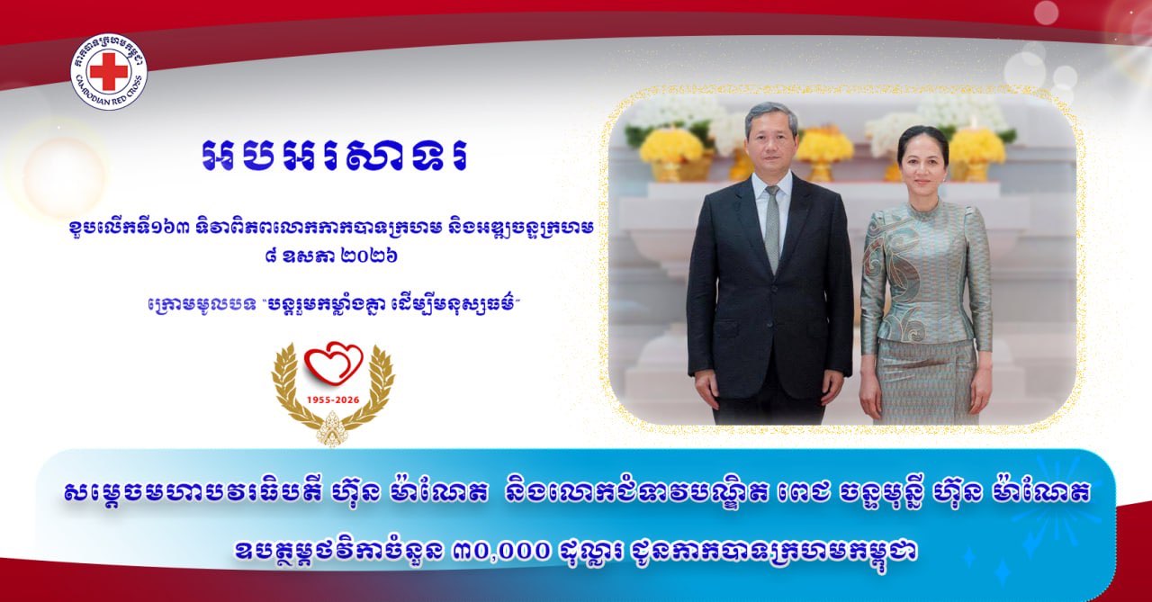 (ភ្នំពេញ)៖ សម្ដេចមហាបវរធិបតី ហ៊ុន ម៉ាណែត នាយករដ្ឋមន្រ្តីនៃព្រះរាជាណាចក្រកម្ពុជា និងលោកជំទាវបណ្ឌិត ពេជ ចន្ទមុន្នី ហ៊ុនម៉ាណែត ឧបត្ថម្ភថវិកាចំនួន ៣ម៉ឺនដុល្លារអាមេរិក ជូនកាកបាទក្រហមកម្ពុជា ក្នុងឱកាសខួបលើកទី១៦៣ ទិវាពិភពលោក កាកបាទក្រហម និងអឌ្ឍចន្ទក្រហម ៨ ឧសភា ឆ្នាំ២០២៦ ក្រោមមូលបទ «បន្តរួមកម្លាំងគ្នា ដើម្បីមនុស្សធម៌»។