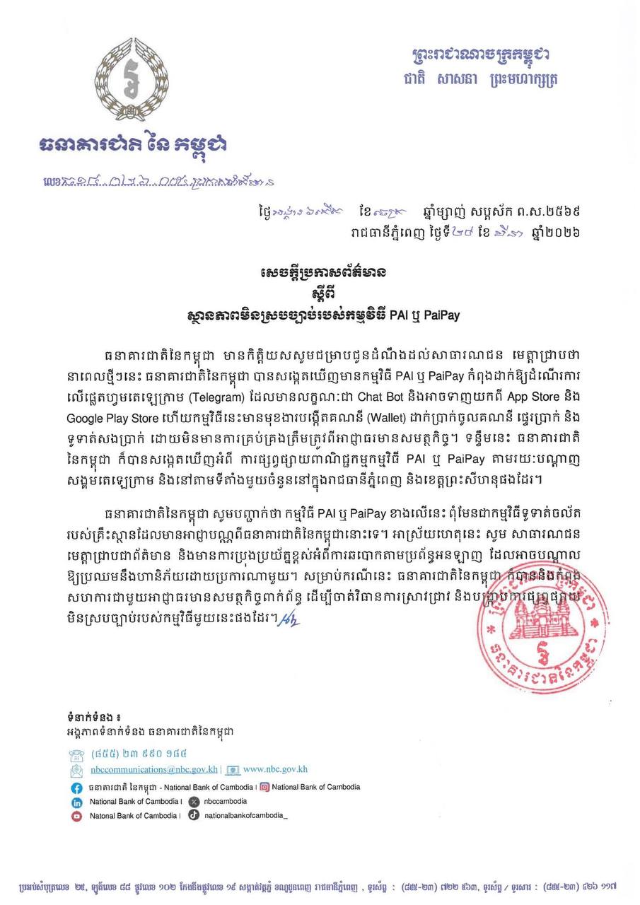 សេចក្តីប្រកាសព័ត៌មាន បានឲ្យដឹងថា នាពេលថ្មីៗនេះ ធនាគារជាតិនៃកម្ពុជា បានសង្កេតឃើញមានកម្មវិធី PAI ឬ PaiPay កំពុងដាក់ឱ្យដំណើរការ លើផ្លេតហ្វូមតេឡេក្រាម (Telegram) ដែលមានលក្ខណៈជា Chat Bot និងអាចទាញយកពី App Store និង Google Play Store ហើយកម្មវិធីនេះមានមុខងារបង្កើតគណនី (Wallet) ដាក់ប្រាក់ចូលគណនី ផ្ទេរប្រាក់ និង ទូទាត់សងប្រាក់ ដោយមិនមានការគ្រប់គ្រងត្រឹមត្រូវពីអាជ្ញាធរមានសមត្ថកិច្ច។
