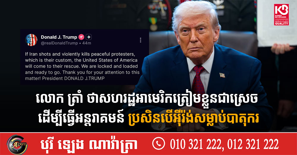 (វ៉ាស៉ីនតោន)៖ នាថ្ងៃសុក្រនេះ ប្រធានាធិបតីអាមេរិក លោក ដូណាល់ ត្រាំ បានប្រកាសថា សហរដ្ឋអាមេរិកត្រៀមលក្ខណៈរួចជាស្រេច ដើម្បីឆ្លើយតប ប្រសិនបើអ៉ីរ៉ង់សម្លាប់ក្រុមបាតុករ បន្ទាប់ពីសកម្មភាពតវ៉ាប្រឆាំងការកើនឡើងថ្លៃទំនិញ នៅក្នុងប្រទេសអ៉ីរ៉ង់ បានឈានដល់ថ្នាក់បង្កឱ្យមានមនុស្សបាត់បង់ជីវិត។ នេះបើតាមការចេញផ្សាយដោយ ទីភ្នាក់ងារព័ត៌មាន AFP នាថ្ងៃសុក្រ ទី២ ខែមករា ឆ្នាំ២០២៦។