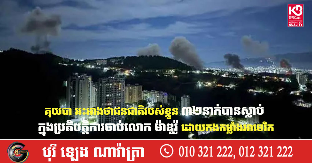 (ឡាហាវ៉ាន)៖ រដ្ឋាភិបាលគុយបា បាននិយាយកាលពីថ្ងៃអាទិត្យ ទី៤ ខែមករាថា ពលរដ្ឋរបស់ខ្លួនចំនួន ៣២នាក់ត្រូវបានសម្លាប់ អំឡុងពេលវាយឆ្មក់របស់សហរដ្ឋអាមេរិកទៅលើប្រទេសវ៉េណេស៊ុយអេឡា ដើម្បីចាប់ប្រធានាធិបតី លោក នីកូឡាស់ ម៉ាឌូរ៉ូ ទៅកាន់សហរដ្ឋអាមេរិក។ នេះបេីយោងតាមការចេញផ្សាយដោយទីភ្នាក់ងារសារព័ត៌មាន Reuters។