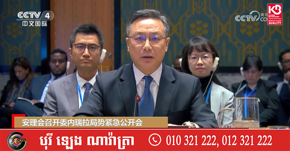 (ប៉េកាំង)៖ នៅថ្ងៃទី ៥ ខែមករា ឆ្នាំ ២០២៦ លោក Sun Lei ភារធារីស្តីទីនៃគណៈប្រតិភូចិន ប្រចាំជាអចិន្ត្រៃយ៍នៅអង្គការសហប្រជាជាតិ បានថ្លែងនៅក្នុងកិច្ចប្រជុំបើកចំហជាបន្ទាន់របស់ក្រុមប្រឹក្សាសន្តិសុខ អង្គការសហប្រជាជាតិស្តីពីស្ថានការណ៍វ៉េណេស៊ុយអេឡាថា ប្រទេសចិនមានការភ្ញាក់ផ្អើលយ៉ាងខ្លាំងចំពោះ ទង្វើគំរាមកំហែងដោយឯកតោភាគី និងខុសច្បាប់របស់សហរដ្ឋអាមេរិក ហើយថ្កោលទោសយ៉ាងខ្លាំងក្លា។
