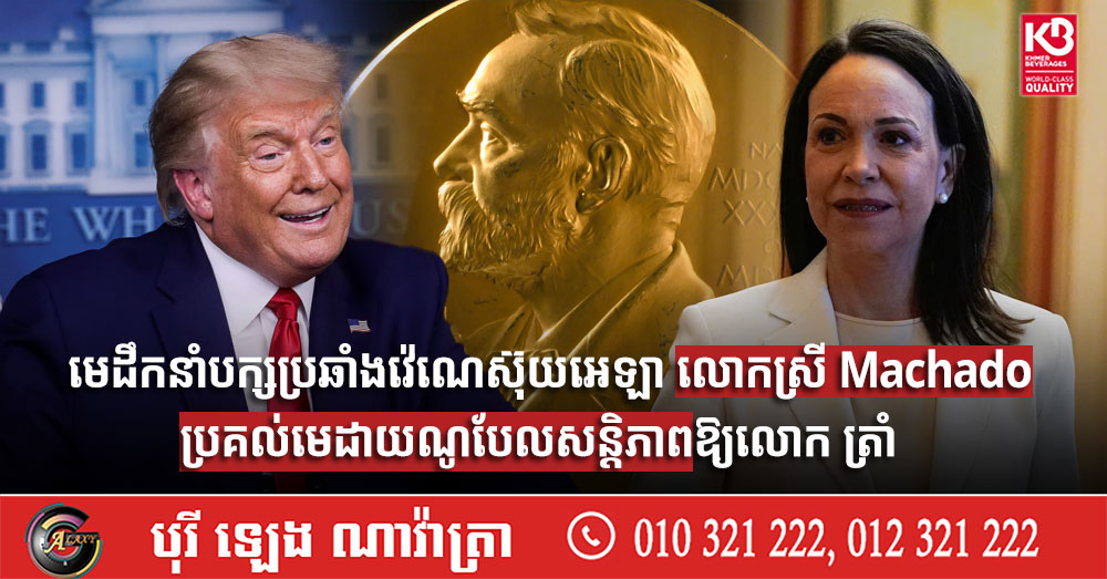 (វ៉ាស៊ីនតោន)៖ មេដឹកនាំគណបក្សប្រឆាំងវ៉េណេស៊ុយអេឡា លោកស្រី Maria Corina Machado បានផ្ដល់មេដាយពានរង្វាន់ណូបែលសន្តិភាពរបស់លោកស្រីទៅឱ្យប្រធានាធិបតីអាមេរិក លោក ដូណាល់ ត្រាំ កាលពីថ្ងៃព្រហស្បតិ៍ ទី១៥ ខែមករា អំឡុងជំនួបមួយនៅឯសេតវិមាន ខណៈលោកស្រីកំពុងព្យាយាមស្វែងរកការគាំទ្រពីលោក ត្រាំ។ នេះបើតាមការចេញផ្សាយដោយទីភ្នាក់ងារសារព័ត៌មាន Reuters។