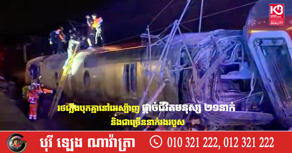 (ម៉ាឌ្រីដ)៖ ក្រុមមន្ត្រីនៅក្នុងប្រទេសអេស្ប៉ាញ នៅថ្ងៃចន្ទ ទី១៩ ខែមករា បានឱ្យដឹងថាមនុស្ស ២១នាក់បានស្លាប់ និង៧០នាក់ផ្សេងទៀតបានរងរបួស នៅក្នុងហេតុការណ៍រថភ្លើងល្បឿនលឿន ២គ្រឿងបុគ្នា នៅក្នុងតំបន់ Andalusia ស្ថិតនៅភាគខាងត្បូងនៃប្រទេស។ នេះបើតាមការចេញផ្សាយដោយទីភ្នាក់ងារសារព័ត៌មាន AFP។