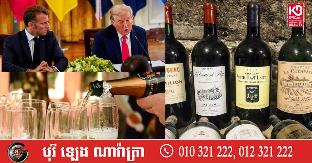 (វ៉ាស៉ីនតោន)៖ នាថ្ងៃចន្ទ ទី១៩ ខែមករា លោក ដូណាល់ ត្រាំ បានគំរាមដំឡើងពន្ធរហូតដល់២០០% លើស្រាក្រហមនិងស្រាសាំប៉ាញរបស់បារាំង ដោយសារតែប្រធានាធិបតីបារាំង ចង់បដិសេធការអញ្ជើញរបស់លោកប្រធានាធិបតីអាមេរិក ឱ្យចូលរួមក្នុង «ក្រុមប្រឹក្សាសន្តិភាព» របស់លោក។ នេះបើតាមការចេញផ្សាយដោយ ទីភ្នាក់ងារព័ត៌មាន AFP។