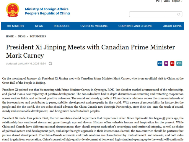 (ប៉េកាំង)៖ "ចិននិងកាណាដាពួតដៃគ្នាកសាងទំនាក់ទំនងភាពជាដៃគូយុទ្ធសាស្ត្របែបថ្មី វានឹងផ្តល់សុខសុភមង្គល និងផលប្រយោជន៍ដល់ប្រទេសទាំងពីរនិងសកលលោក ។ល។ ប្រព័ន្ធផ្សព្វផ្សាយអន្តរជាតិបានវាយតម្លៃខ្ពស់ ចំពោះដំណើរទស្សនកិច្ចរបស់លោក Mark Carney នាយករដ្ឋមន្ត្រីកាណាដានៅប្រទេសចិនចាប់ពីថ្ងៃទី ១៤ ដល់ថ្ងៃទី ១៧ ខែមករា ឆ្នាំ ២០២៦ ។ នេះគឺជាដំណើរទស្សនកិច្ចរបស់នាយករដ្ឋមន្ត្រីកាណាដា នៅប្រទេសចិនម្តងទៀតបន្ទាប់ពី រំលងអស់រយៈពេល ៨ ឆ្នាំ ។ ក្នុងអំឡុងពេលដំណើរទស្សនកិច្ចលើកនេះ លោក ស៊ី ជីនភីង ប្រធានរដ្ឋចិនបានជួប ពិភាក្សាការងារជាមួយលោក Mark Carney នាយករដ្ឋមន្ត្រីកាណាដាដោយលើកឡើងថា ភាគីទាំងពីរត្រូវធ្វើជាដៃគូ ដែលគោរពគ្នាទៅវិញទៅមក ដៃគូដែលរួមគ្នាអភិវឌ្ឍ ដៃគូដែលជឿទុកចិត្តគ្នាទៅវិញទៅមកនិងជាដៃគូ ដែលសម្របសម្រួល និងសហការគ្នាដើម្បីផ្តល់ការណែនាំជាយុទ្ធសាស្ត្រ សម្រាប់ទំនាក់ទំនងទ្វេភាគីក្នុងការត្រួសត្រាយអនាគតថ្មី ។ ភាគីទាំងពីរបានចេញផ្សាយ «សេចក្តីថ្លែងការណ៍រួមស្តីពីកិច្ចជំនួបរវាងថ្នាក់ដឹកនាំចិននិងកាណាដា» ដោយឯកភាពគ្នាថា នឹងជំរុញទំនាក់ទំនងភាពជាដៃគូយុទ្ធសាស្ត្របែបថ្មីរវាងចិននិងកាណាដា។