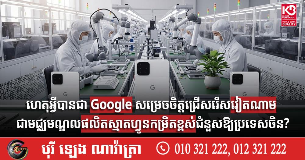 (បរទេស)៖ នៅក្នុងរបត់ថ្មីនៃខ្សែសង្វាក់ផ្គត់ផ្គង់បច្ចេកវិទ្យាពិភពលោក ក្រុមហ៊ុនយក្ស Google បានប្រកាសជាផ្លូវការនូវការផ្លាស់ប្តូរទីតាំងផលិតស្មាតហ្វូនកម្រិតខ្ពស់ (High-end) របស់ខ្លួនមករកប្រទេសវៀតណាមចាប់ពីឆ្នាំនេះតទៅ។ ការសម្រេចចិត្តនេះ មិនត្រឹមតែជាការផ្លាស់ប្តូរទីតាំងរោងចក្រធម្មតានោះទេ ប៉ុន្តែវាគឺជាការឆ្លុះបញ្ចាំងពីការកើនឡើងនូវសមត្ថភាពបច្ចេកវិទ្យារបស់វៀតណាម និងយុទ្ធសាស្ត្រ ភូមិសាស្ត្រនយោបាយថ្មីរបស់ក្រុមហ៊ុនបច្ចេកវិទ្យាអាមេរិក។