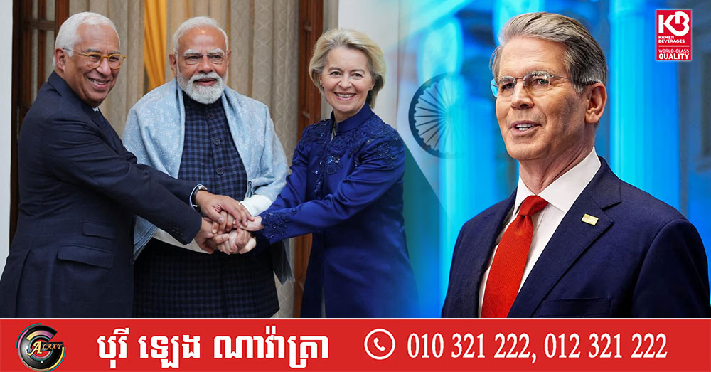 (វ៉ាស៉ីនតោន)៖ នាថ្ងៃពុធ ទី២៨ ខែមករា រដ្ឋមន្រ្តីហិរញ្ញវត្ថុសហរដ្ឋអាមេរិក លោក Scott Bessent បាននិយាយថា រូបលោកខកចិត្តជាខ្លាំង ដោយសារតែអឺរ៉ុបបានចុះកិច្ចព្រមព្រៀងពាណិជ្ជកម្មធំមួយជាមួយឥណ្ឌា ហើយលោកបានលើកឡើងថា វាឆ្លុះបញ្ចាំងឱ្យឃើញថា អឺរ៉ុបយករឿងពាណិជ្ជកម្មធំជាងផលប្រយោជន៍រប់សប្រជាជនអ៊ុយក្រែន។ នេះបើតាមការចេញផ្សាយដោយ ទីភ្នាក់ងារព័ត៌មាន Reuters។