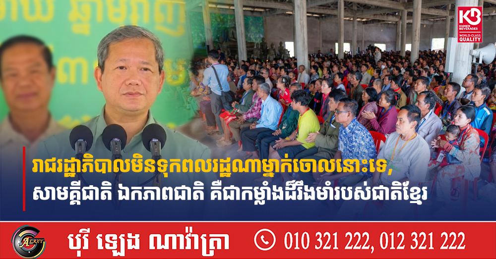 (ភ្នំពេញ)៖ សម្ដេចបវរធិបតី ហ៊ុន ម៉ាណែត នាយករដ្ឋមន្ត្រីនៃកម្ពុជា បានបានប្រកាសថា រាជរដ្ឋាភិបាលកម្ពុជា នឹងមិនទុកពលរដ្ឋណាម្នាក់ចោលនោះទេ ហើយ សាមគ្គីជាតិ ឯកភាពជាតិរវាងរាជរដ្ឋាភិបាល និងប្រជាពលរដ្ឋនាពេលនេះ គឺជាកម្លាំងដ៏រឹងមាំរបស់ជាតិខ្មែរ។