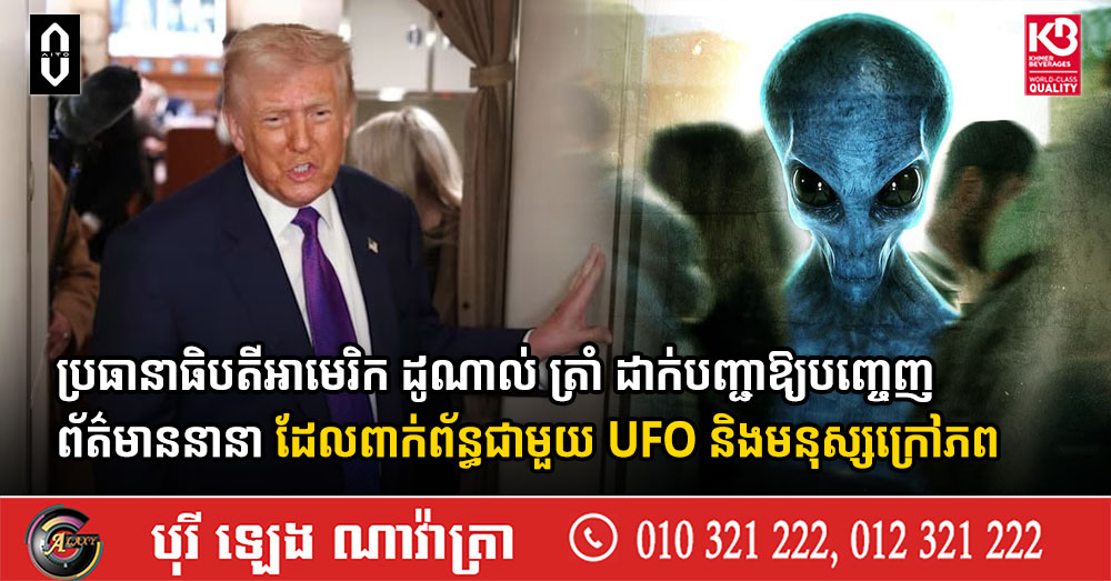 (វ៉ាស៉ីនតោន)៖ កាលពីថ្ងៃព្រហស្បតិ៍ ទី១៩ ខែកុម្ភៈ ប្រធានាធិបតីសហរដ្ឋអាមេរិក លោក ដូណាល់ ត្រាំ បានឱ្យដឹងថា រូបលោកកំពុងដាក់បទបញ្ជាឱ្យបណ្តាស្ថាប័នសហព័ន្ធទាំងអស់ ចាប់ផ្តើមកំណត់ស្វែងរកហើយបញ្ចេញឯកសាររដ្ឋាភិបាលទាំងឡាយ ដែលពាក់ព័ន្ធជាមួយវត្ថុហោះហើរអាថ៌កំបាំង UFO ព្រមទាំងអេលៀន ខណៈវាគឺជាអ្វីដែលប្រជាជនអាមេរិកមួយចំនួន ចង់ឱ្យធ្វើជាយូរមកហើយ។ នេះបើតាមការចេញផ្សាយដោយ ទីភ្នាក់ងារព័ត៌មាន AFP។
