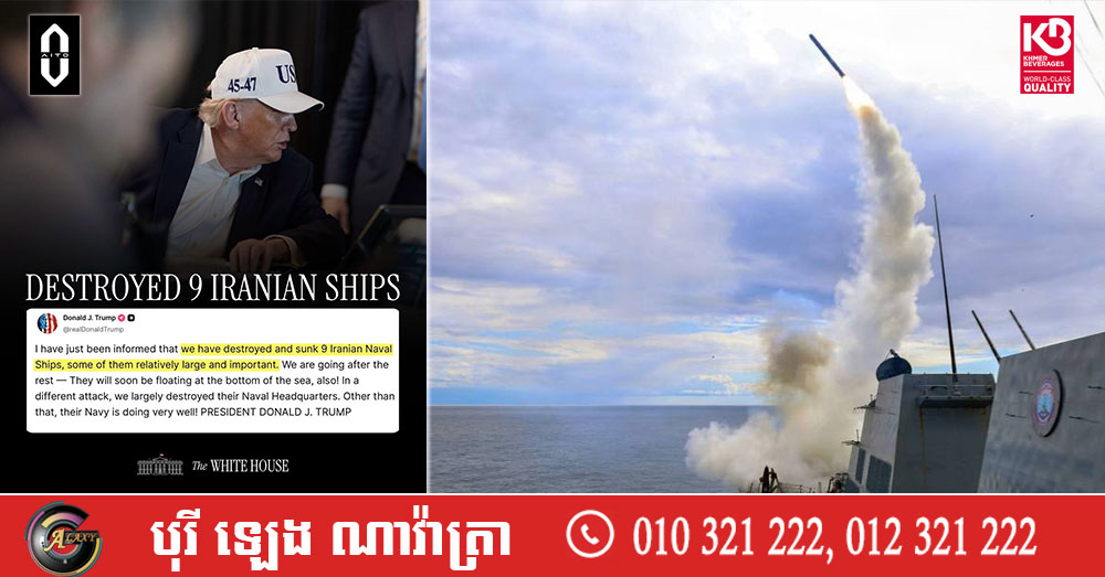 (វ៉ាស៊ីនតោន)៖ ប្រធានាធិបតីអាមេរិក លោក ដូណាល់ ត្រាំ បានឱ្យដឹងកាលពីថ្ងៃអាទិត្យ ទី១ ខែមីនា ឆ្នាំ២០២៦ ថាកងកម្លាំងអាមេរិកបាញ់ពន្លិចនាវាចម្បាំង៩គ្រឿង និងកម្ទេច ទីស្នាក់ការកងទ័ពជើងទឹករបស់អ៉ីរ៉ង់។ នេះបើតាមការចេញផ្សាយដោយសារព័ត៌មានអាមេរិក Axios។
