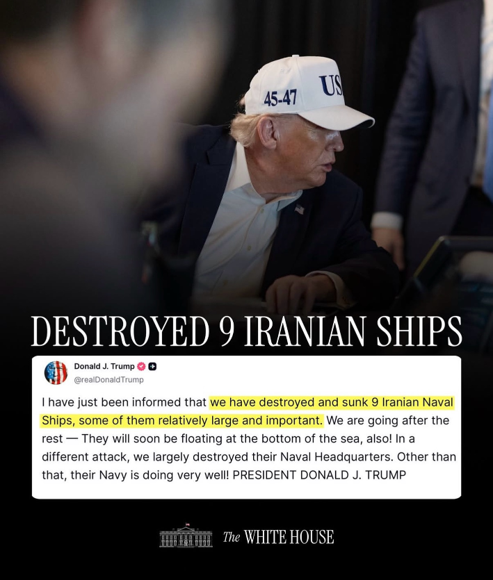 លោក ត្រាំ នៅក្នុងការបង្ហោះលើបណ្ដាញទំនាក់ទំនងសង្គម Truth Social បានសរសេរថា «ខ្ញុំទើបតែទទួលបានព័ត៌មានថាយើងបានបំផ្លាញ និងពន្លិចនាវាចម្បាំង៩គ្រឿងរបស់ អ៉ីរ៉ង់...នៅក្នុងការវាយប្រហារផ្សេងមួយទៀត យើងបានកម្ទេចទីស្នាក់ការកងទ័ពជើងទឹករបស់ពួកគេមួយផ្នែកធំ»។