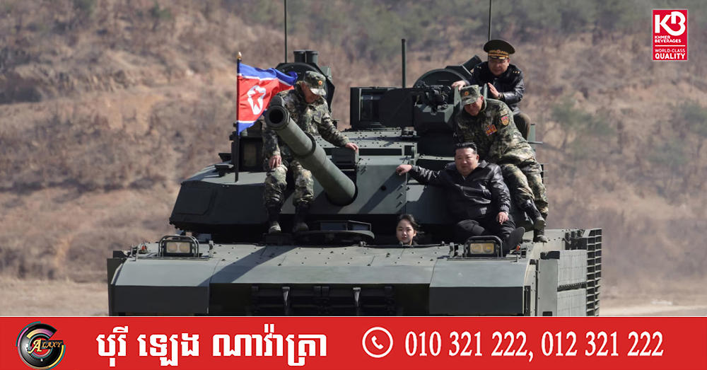 (ព្យុងយ៉ាង)៖ នាថ្ងៃសុក្រ ទី២០ ខែមីនា ទីភ្នាក់ងារព័ត៌មានរដ្ឋកូរ៉េខាងជើង KCNA បានរាយការណ៍ថា មេដឹកនាំកំពូល លោក គីម ជុងអ៊ុន បាននាំកូនស្រីវ័យជំទង់របស់លោក ត្រួតពិនិត្យការធ្វើសមយុទ្ធយោធាធំមួយ ដែលបង្ហាញពីសមត្ថភាពរថក្រោះស៊េរីថ្មី។ នេះបើតាមការចេញផ្សាយដោយ ទីភ្នាក់ងារព័ត៌មាន Reuters។