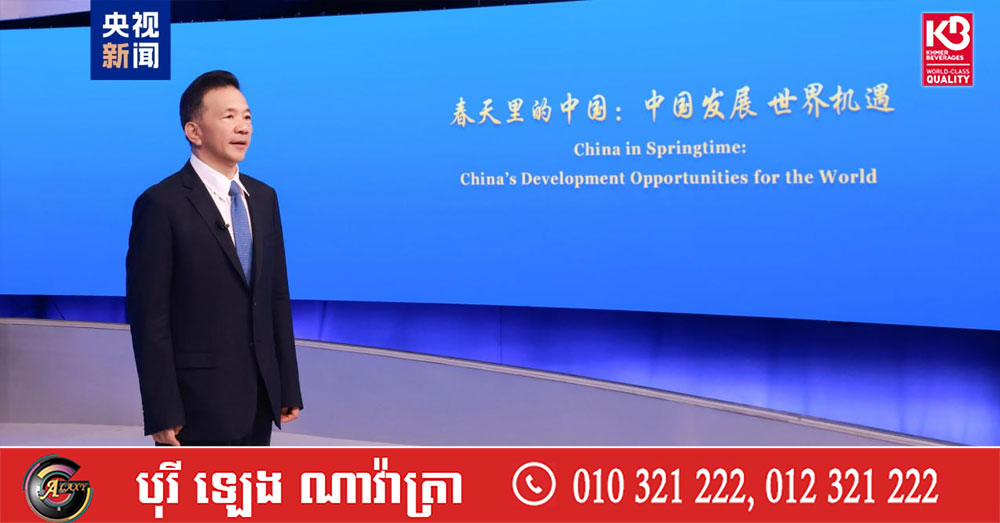 (ប៉េកាំង)៖ ថ្ងៃទី២០ ខែមីនា តាមម៉ោងក្នុងតំបន់ កិច្ចសន្ទនាសកលស្តីពី “ប្រទេសចិនក្នុងរដូវផ្ការីក៖ការអភិវឌ្ឍរបស់ចិន កាលានុវត្តភាពរបស់ពិភពលោក” ដែលរៀបចំដោយអគ្គស្ថានីយវិទ្យុនិងទូរទស្សន៍មជ្ឈិមចិនបានប្រារព្ធធ្វើនៅក្រុងបាងកក ប្រទេសថៃ។ លោក Shen Haixiong អនុរដ្ឋមន្ត្រីនៃក្រសួងឃោសនាការនៃគណៈកម្មាធិការមជ្ឈិមបក្សកុម្មុយនីស្តចិននិងជាអគ្គនាយកនៃអគ្គស្ថានីយវិទ្យុនិងទូរទស្សន៍មជ្ឈិមចិន បានថ្លែងសុន្ទរកថាតាមប្រព័ន្ធវីដេអូ។ភ្ញៀវកិត្តិយសជាង២០០នាក់ដែលមកពីមជ្ឈដ្ឋាននយោបាយ ពាណិជ្ជកម្ម សិក្សាស្រាវជ្រាវនិងប្រព័ន្ធសារព័ត៌មានជាដើមបានអញ្ជើញចូលរួមសកម្មភាពលើកនេះ។