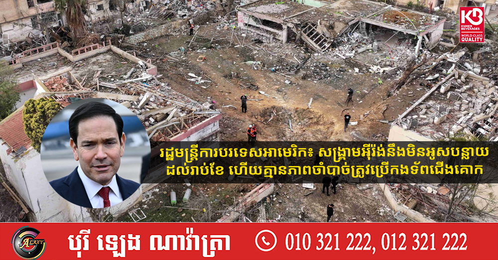 (ប៉ារីស)៖ កាលពីថ្ងៃសុក្រ ទី២៧ ខែមីនា រដ្ឋមន្រ្តីការបរទេសអាមេរិក លោក Marco Rubio បាននិយាយថា សហរដ្ឋអាមេរិករំពឹងថា ប្រតិបត្តិការយោធាប្រឆាំងអ៉ីរ៉ង់ នឹងបញ្ចប់ក្នុងពេលប៉ុន្មានសប្តាហ៍ទៀត ពោលគឺនឹងមិនអូសបន្លាយដល់រាប់ខែឡើយ ហើយទីក្រុងវ៉ាស៉ីនតោន អាចសម្រេចគោលដៅទាំងអស់របស់ខ្លួន ដោយមិនចាំបាច់ត្រូវប្រើកងកម្លាំងជើងគោក។ នេះបើតាមការចេញផ្សាយដោយ ទីភ្នាក់ងារព័ត៌មាន Reuters។