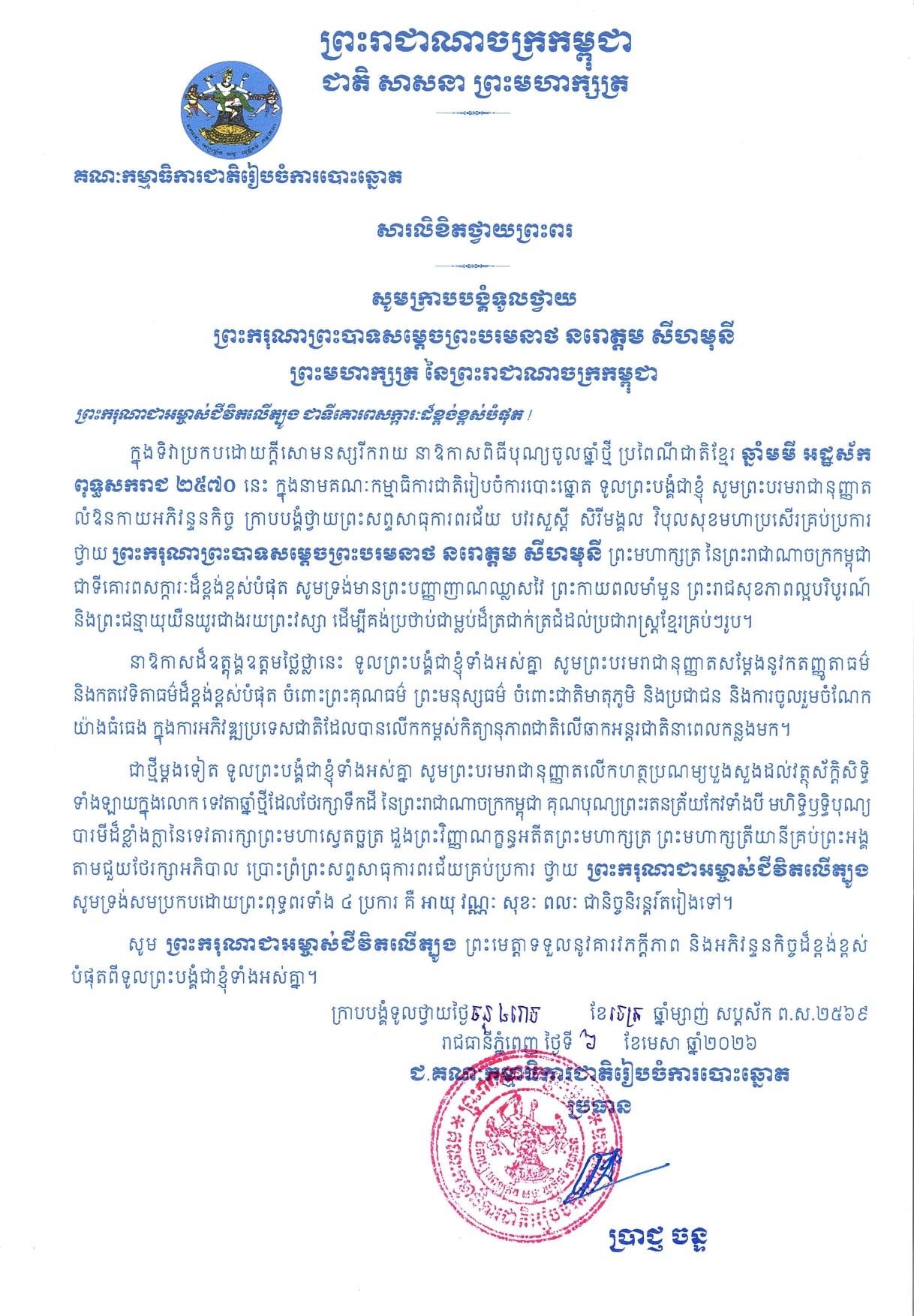 (ភ្នំពេញ)៖ ឯកឧត្តម ប្រាជ្ញ ចន្ទ ប្រធានគណៈកម្មាធិការជាតិរៀបចំការបោះឆ្នោត (គ.ជ.ប) និងមន្ត្រីរាជការក្រោមឱវាទទាំងអស់ សូមព្រះបរមរាជានុញ្ញាត ក្រាបបង្គំទូលថ្វាយព្រះពរ ព្រះករុណាព្រះបាទសម្តេចព្រះបរមនាថ នរោត្តម សីហមុនី ព្រះមហាក្សត្រនៃកម្ពុជា និងសម្ដេចព្រះមហាក្សត្រី នរោត្តម មុនិនាថ សីហនុ ព្រះវររាជមាតាជាតិខ្មែរ ជាទីគោរពសក្ការៈដ៏ខ្ពង់ខ្ពស់បំផុត នៅក្នុងឱកាសពិធីបុណ្យចូលឆ្នាំថ្មី ប្រពៃណីជាតិខ្មែរ ឆ្នាំមមី អដ្ឋស័ក ពុទ្ធសករាជ ២៥៦៩ ត្រូវនឹងថ្ងៃទី ១៤-១៥-១៦ ខែមេសា ឆ្នាំ២០២៦ សូមព្រះអង្គទ្រង់ប្រកបដោយព្រះកាយពលរឹងមាំខ្លាំងក្លា ព្រះបញ្ញាញាណភ្លឺថ្លាត្រចះត្រចង់ ព្រះរាជសុខភាពល្អបរិបូរណ៍ ព្រះជន្មាយុយឺនយូរជាងរយព្រះវស្សា ចាកផុតពីព្រះរោគាព្យាធិ ដើម្បីព្រះអង្គទ្រង់គង់ប្រថាប់នៅក្នុងព្រះបរមសិរីរាជសម្បត្តិ ជាព្រះម្លប់ដ៏ត្រជាក់ត្រជុំ សម្បូរសប្បាយ ចម្រុងចម្រើន ថ្កុំថ្កើងរុងរឿងរបស់មាតុភូមិកម្ពុជាជាទីស្នេហា និងប្រជានុរាស្ត្រ ដើម្បីបន្តព្រះរាជបេសកកម្មដ៏ឧត្តុង្គឧត្តម។