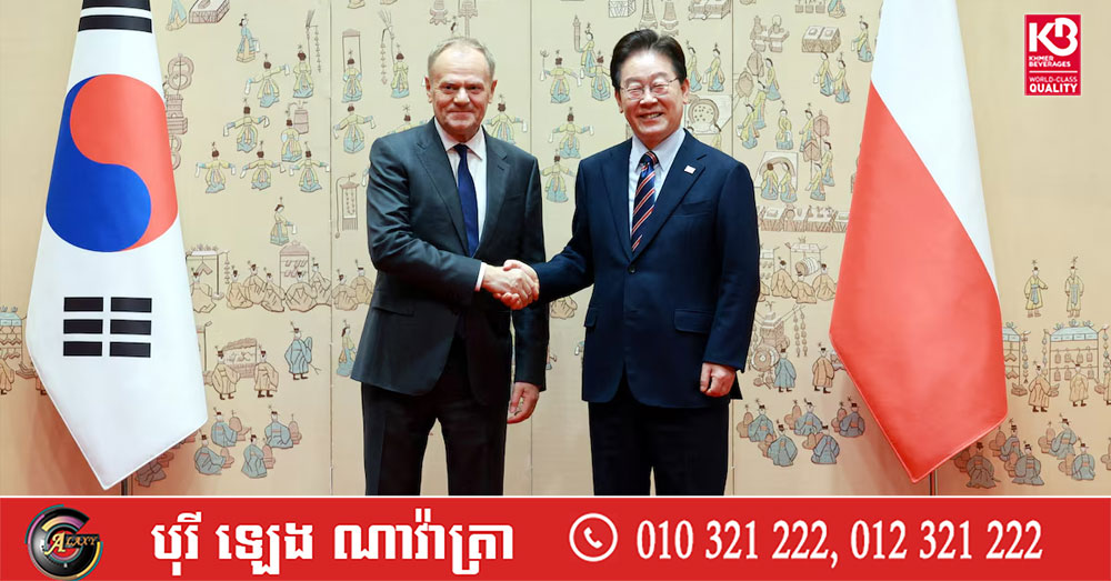 (សេអ៊ូល)៖ កូរ៉េខាងត្បូង និងប៉ូឡូញបានសាទរចំពោះភាពជាដៃគូការពារជាតិដ៏ស៉ីជម្រៅ អំឡុងពេលដែលនាយករដ្ឋមន្ត្រី Donald Tusk ទៅដល់ទីក្រុងសេអ៊ូល សម្រាប់ដំណើរទស្សនកិច្ចលើកដំបូងក្នុងរយៈពេល ២៧ឆ្នាំ ហើយបានបើកកិច្ចប្រជុំកំពូល ជាមួយប្រធានាធិបតី Lee Jae Myung នាថ្ងៃចន្ទ ទី១៣ ខែមេសា ឆ្នាំ២០២៦។ នេះបេីយោងតាមការចេញផ្សាយដោយ ទីភ្នាក់ងារសារព័ត៌មាន Reuters។