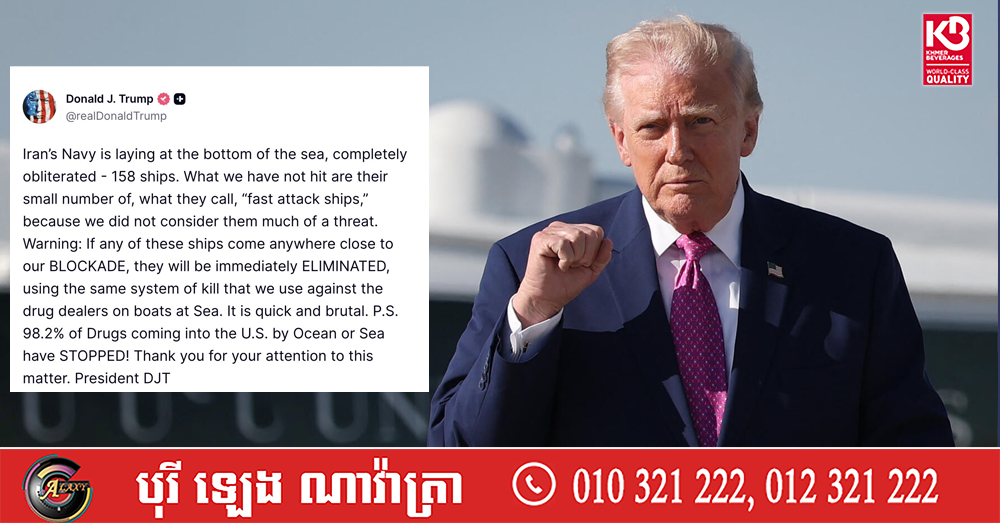 (វ៉ាស៊ីនតោន)៖ ប្រតិបត្តិការបិទខ្ទប់របស់សហរដ្ឋអាមេរិកទៅលើកំពង់ផែនានារបស់ប្រទេសអ៊ីរ៉ង់ បានចូលជាធរមានជាផ្លូវការហើយ ខណៈប្រធានាធិបតីអាមេរិក លោក ដូណាល់ ត្រាំ បានព្រមានយ៉ាងចាស់ដៃថា រាល់នាវាវាយប្រហារល្បឿនលឿនរបស់អ៊ីរ៉ង់ដែលព្យាយាមចូលជិតតំបន់បិទខ្ទប់នេះ នឹងត្រូវកម្ទេចចោលភ្លាមៗតែម្តង។ នេះបើតាមការចេញផ្សាយ ដោយបណ្តាញព័ត៌មានអន្តរជាតិ។