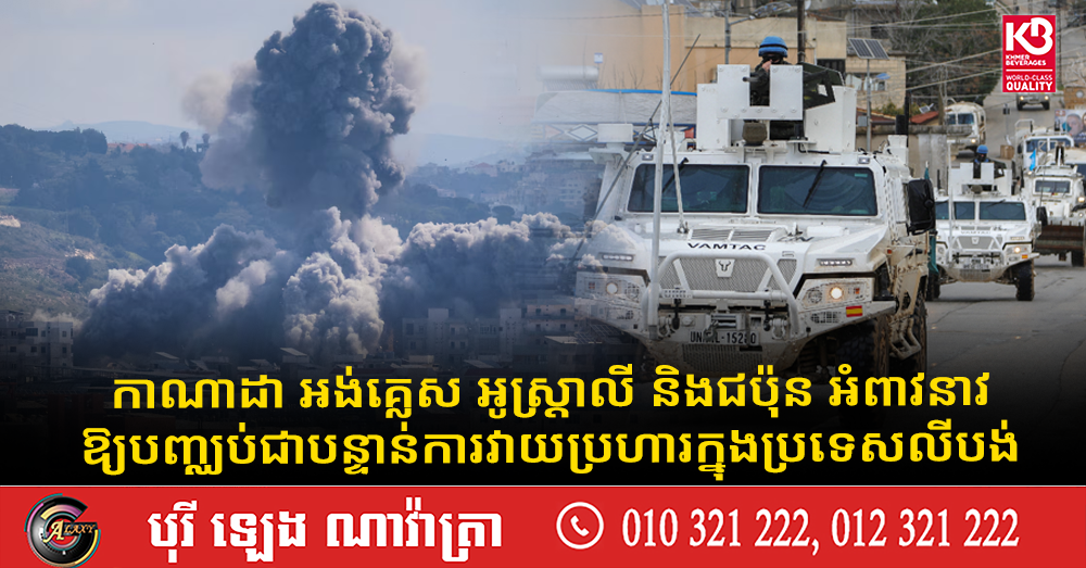 (វ៉ាស៊ីនតោន)៖ កាណាដា ចក្រភពអង់គ្លេស អូស្ត្រាលី ជប៉ុន និងប្រទេសចំនួន៦ផ្សេងទៀត បានថ្កោលទោសការសម្លាប់កងទ័ពមួកខៀវ UN នៅក្នុងប្រទេសលីបង់ ខណៈអំពាវនាវឱ្យមានការបញ្ឈប់ជាបន្ទាន់នូវរាល់ការវាយប្រហារទាំងអស់នៅក្នុងប្រទេសមួយនេះជាទីដែលការវាយប្រហាររបស់អ៉ីស្រាអែលបានសម្លាប់មនុស្សច្រើនជាង ២០០០នាក់ ចាប់តាំងពីខែមីនាមក។ នេះបើតាមការចេញផ្សាយដោយទីភ្នាក់ងារសារព័ត៌មាន Reuters។